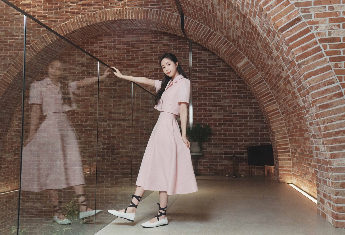 은은한 핑크 컬러의 크롭 재킷과 스커트 셋업을 매치하여 세련되면서도 로맨틱한 무드를 보여줬다