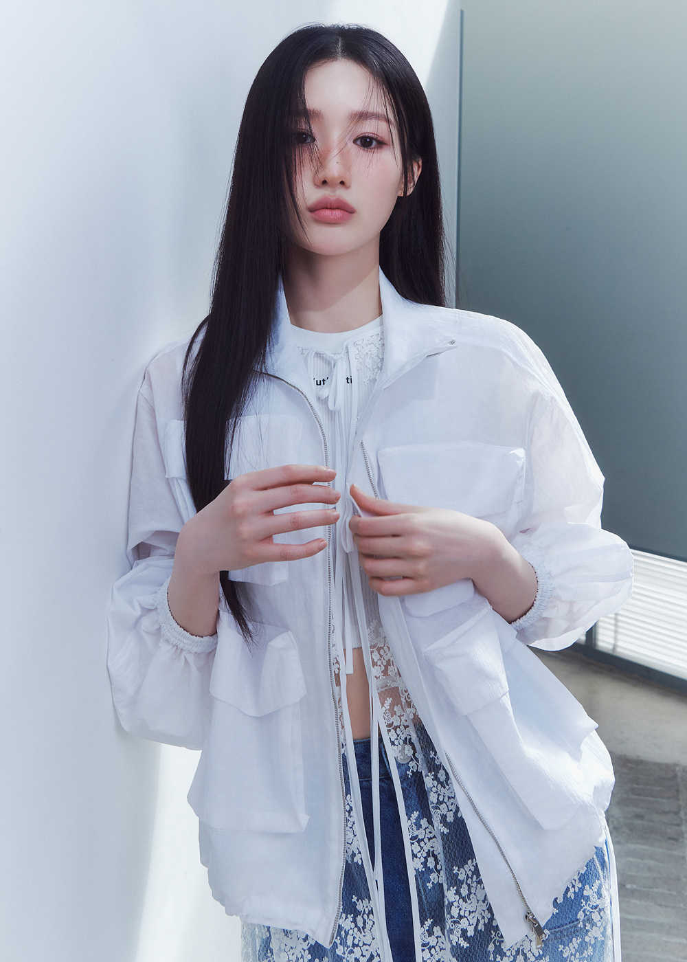 특히 조혜주는 클린한 구조감과 코팅된 페브릭의 유틸리티 포켓 점퍼와 오버사이즈의 박시한 포인트인 피케 스트라이프 티셔츠