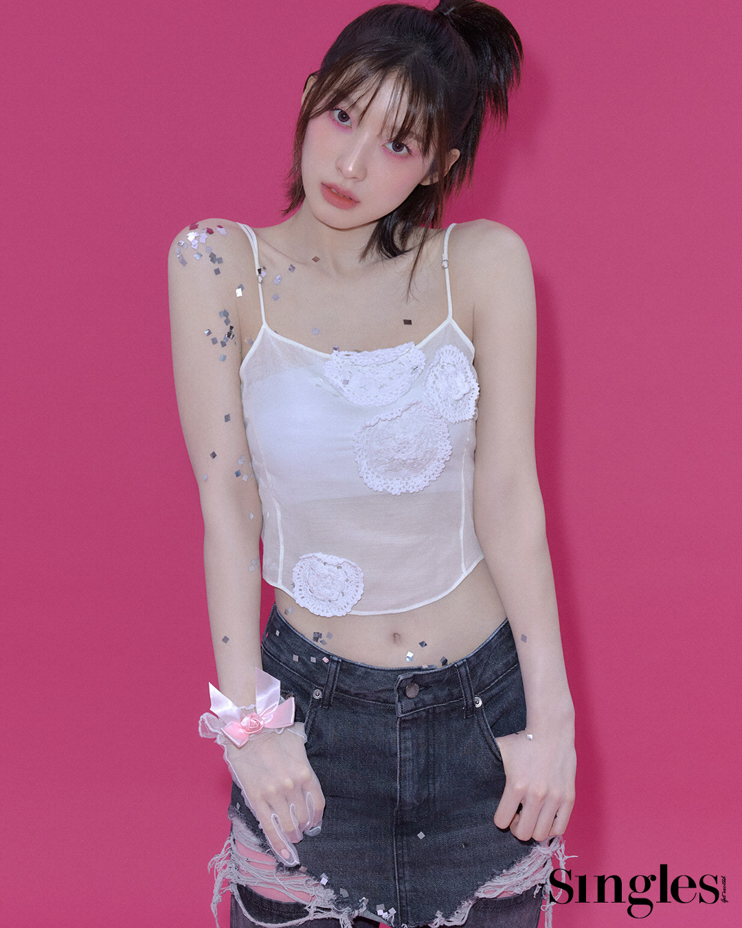그 외에도 시크하고 도발적인 네온 핑크 컬러의 아이 메이크업과 화이트 플라워 톱에 컷아웃 데님을 매치한 키치하고 펑키한 스타일링을 선보이며 반전 매력과 함께 인형 같은 비주얼을 뽐냈다