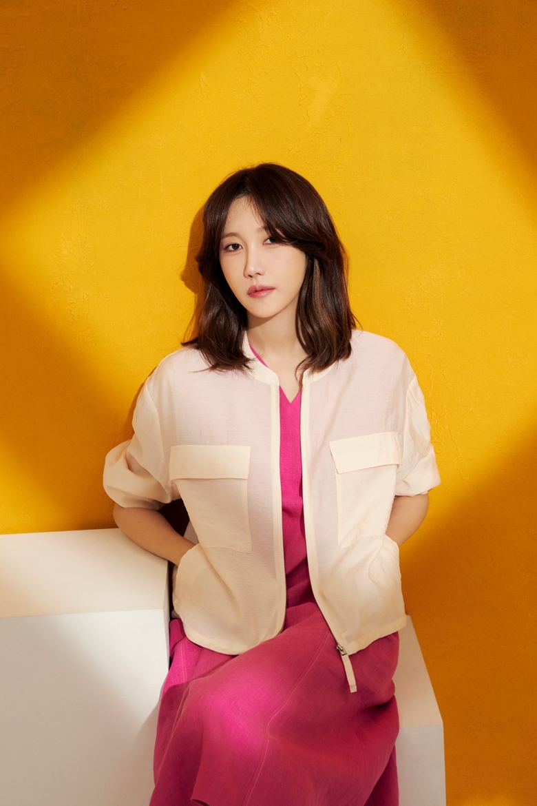 화보 속 이지아는 채도가 높은 핑크 컬러의 원피스에 얇은 점퍼를 착용하거나 스트라이프 티셔츠