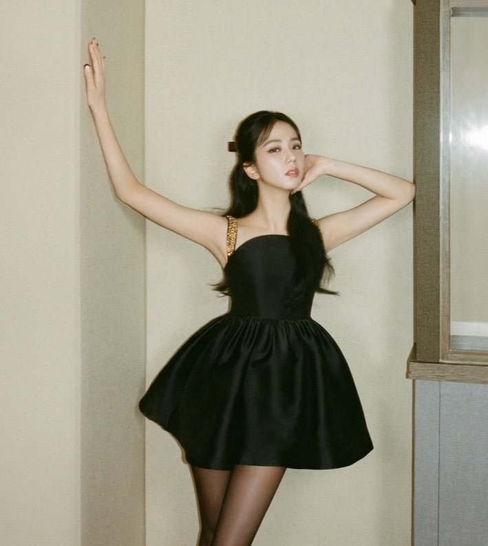 공개된 사진 속 지수는 매력을 발산하며 데님, 이브닝 드레스, 기퓌르 레이스 등 다양한 의상을 소화했다.
