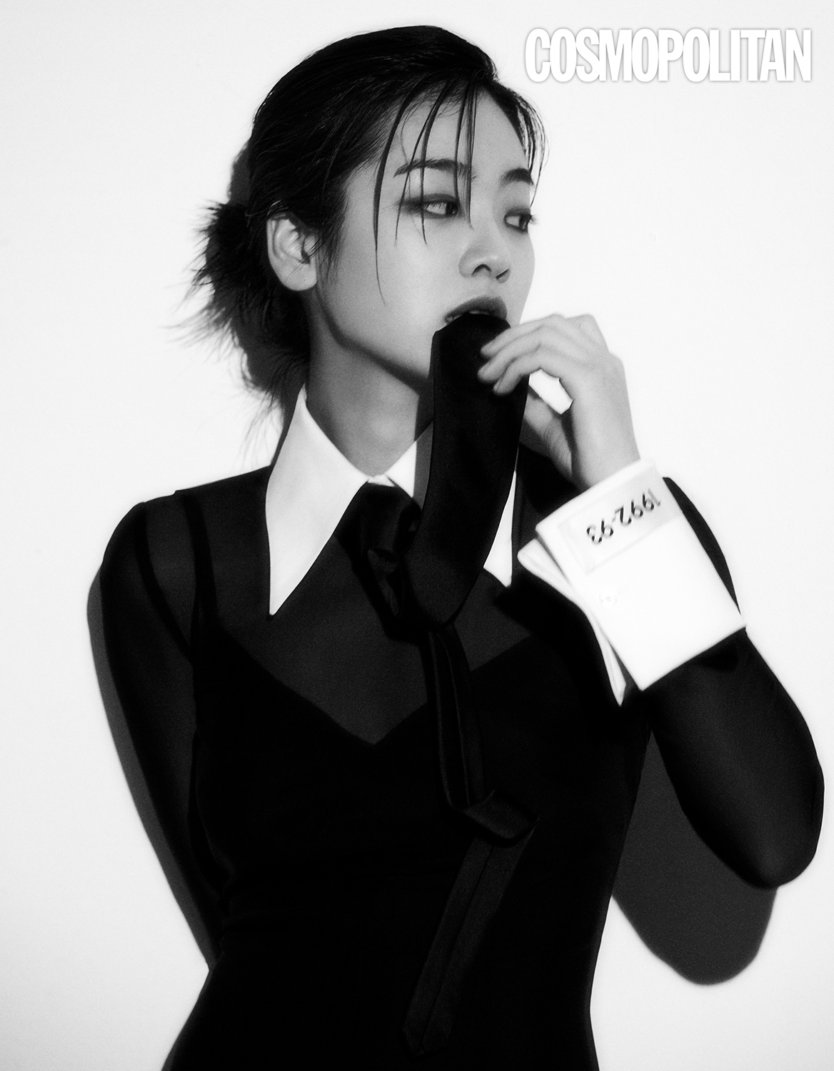 짙은 메이크업으로 타이를 입에 문 흑백 컷으로는 강렬한 무드를 선보였고