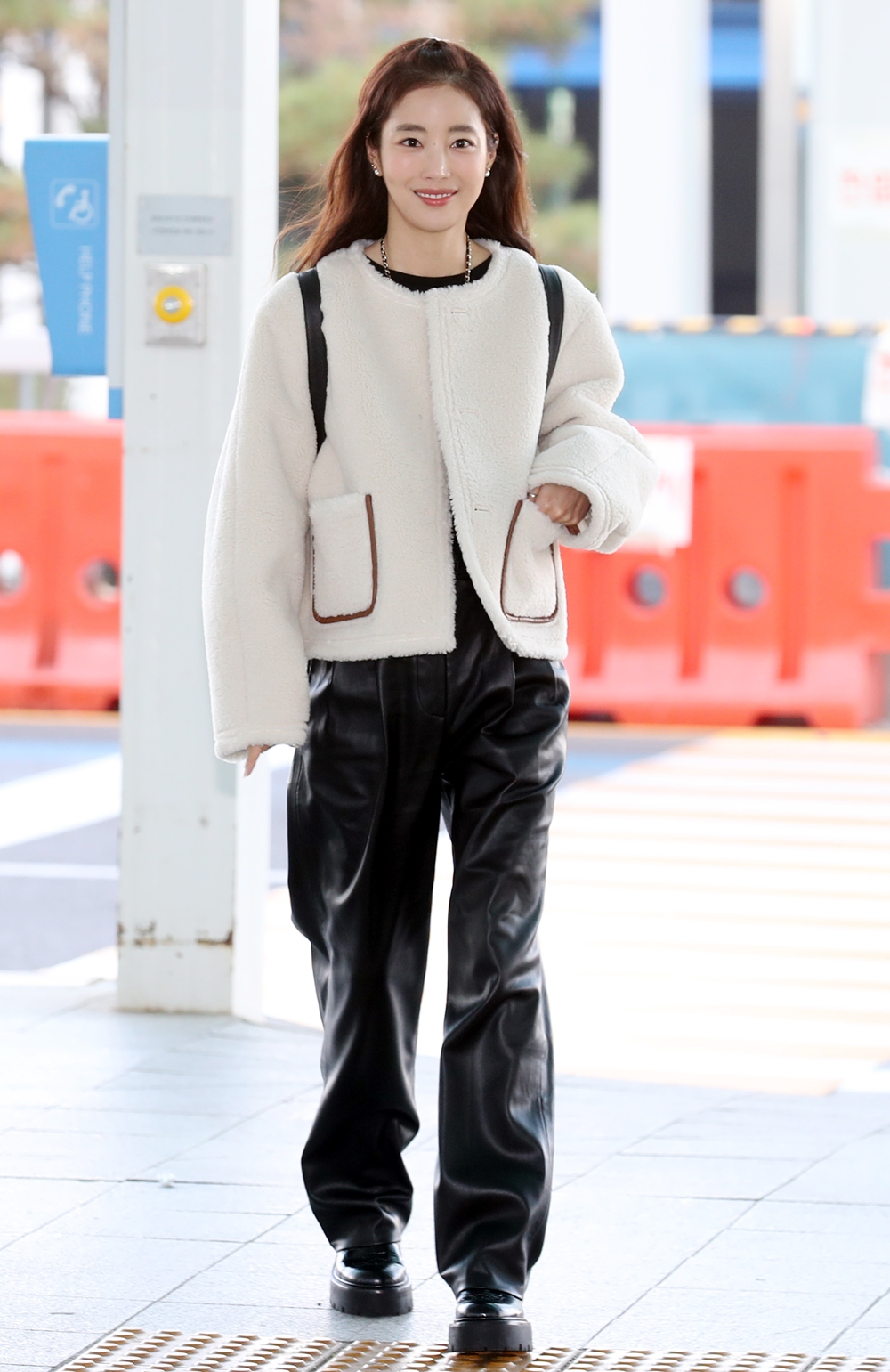 기은세는 아이보리 점퍼에 블랙 레더 팬츠를 매치한 스타일리시한 공항패션을 연출했는데