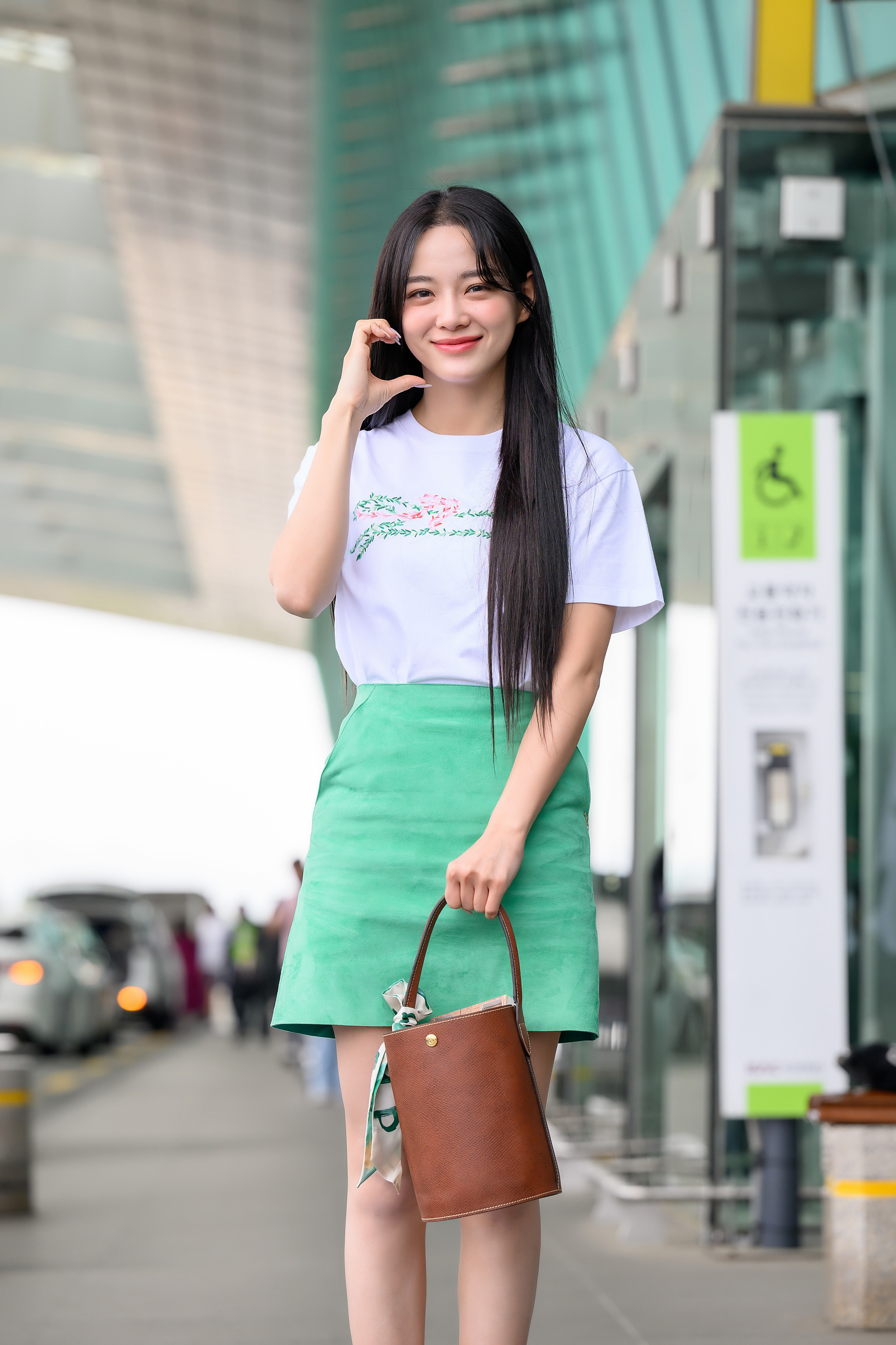 김세정은 감각적인 프린팅이 돋보이는 티셔츠에 그린 컬러의 미니 스커트
