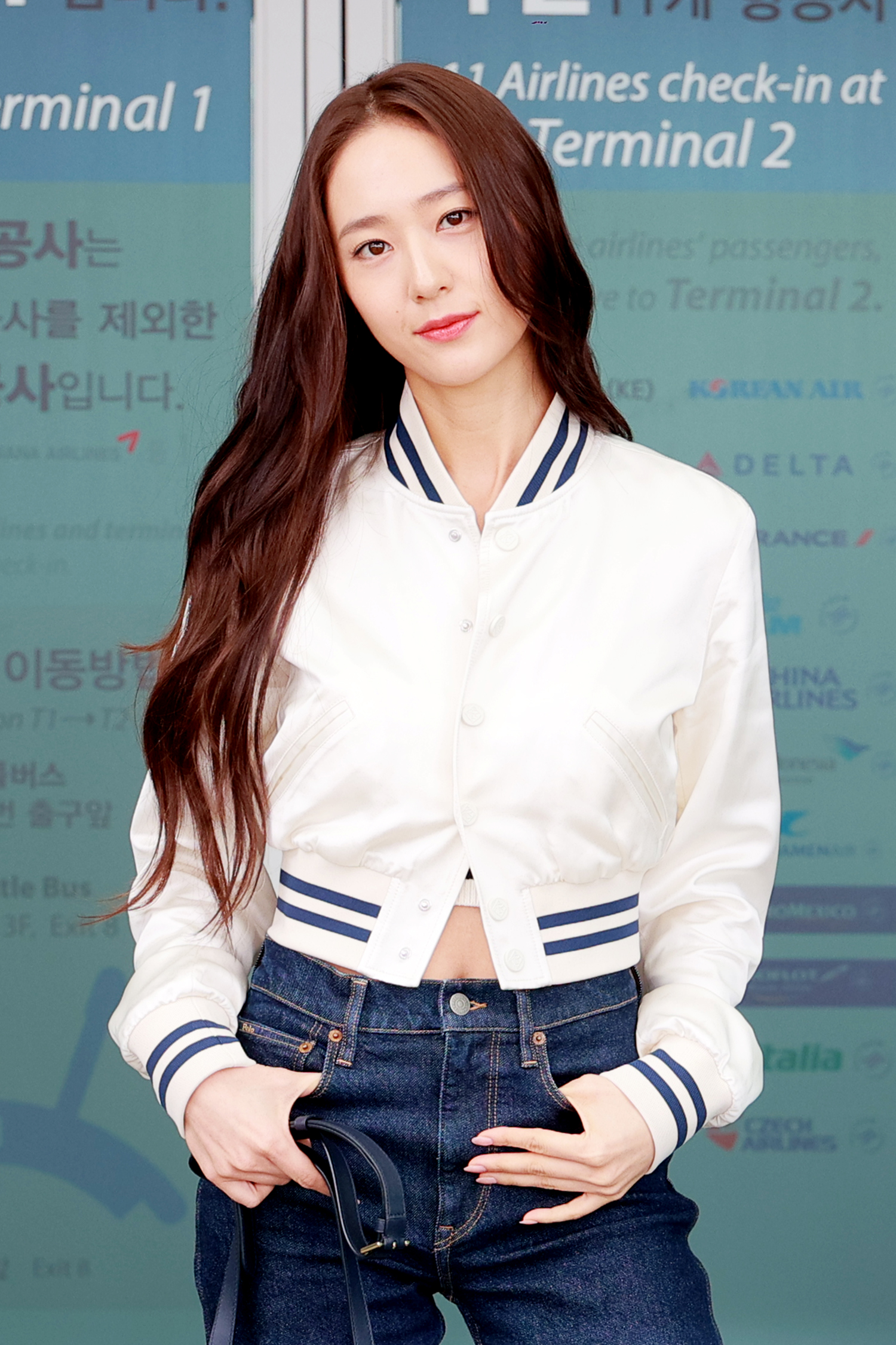 출국에 앞서 크리스탈은 스트레이트 핏 데님 팬츠에 랄프 로렌 컬렉션의 고급스러운 광택이 돋보이는 워시드 새틴 소재의 크롭한 기장감의 재킷과 정교하면서도 클래식한 웰링턴 백을 더해 우아하면서도 스포티한 무드의 공항패션을 완성했다