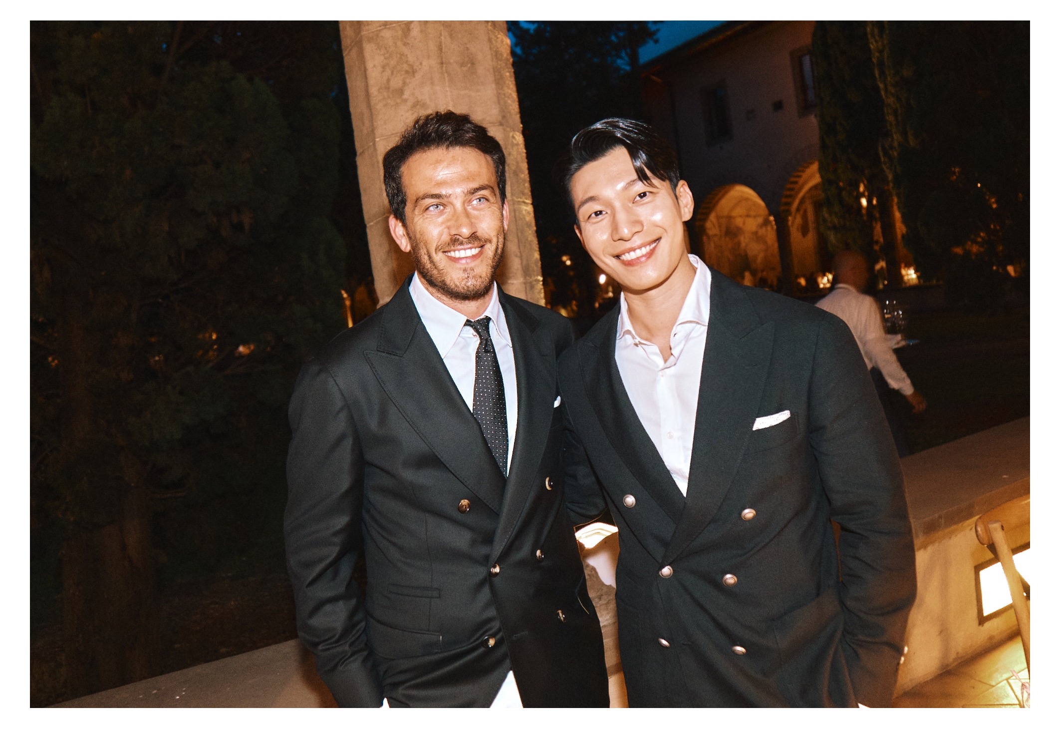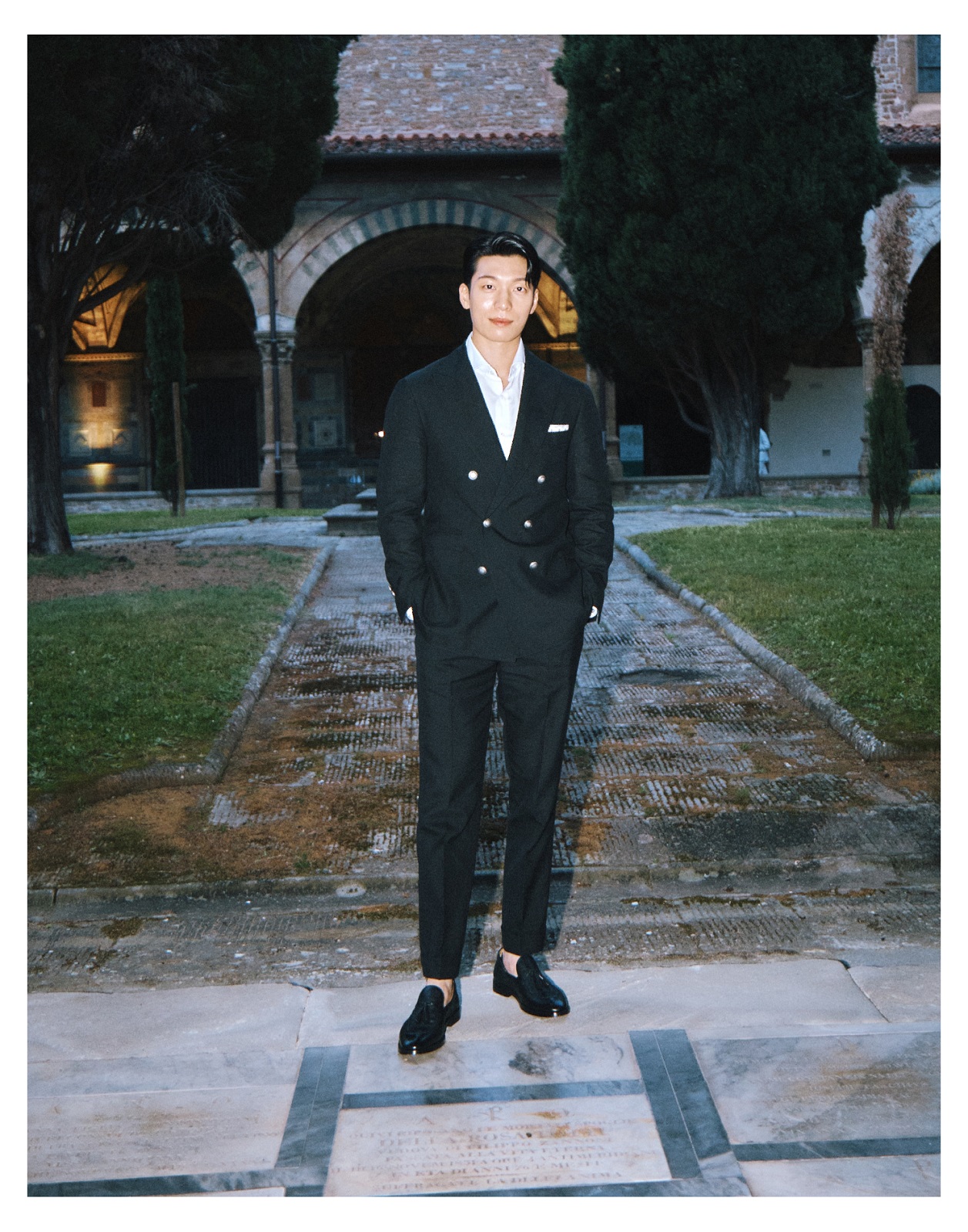 이날 위하준은 브루넬로 쿠치넬리의 클래식한 프렌치 카라 드레스 셔츠에 블랙 더블 수트를 착용해 완벽한 수트핏을 선보였다