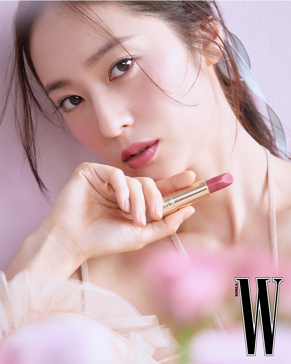 를 촉촉하게 발라 핑크빛 장미처럼 사랑스럽게 연출했다