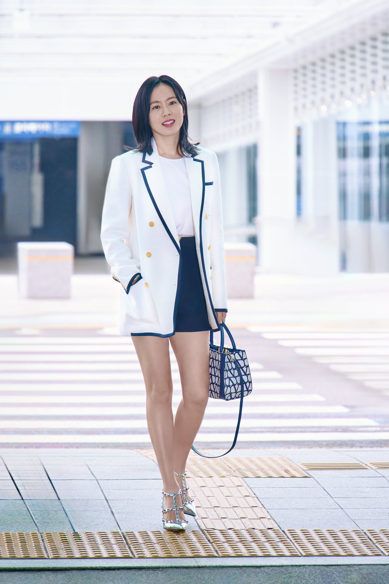 오랜만의 외출을 알린 손예진은 네이비 컬러 라이닝이 들어간 화이트 컬러의 크리스프 트위드 더블 브레스트 재킷과 메탈