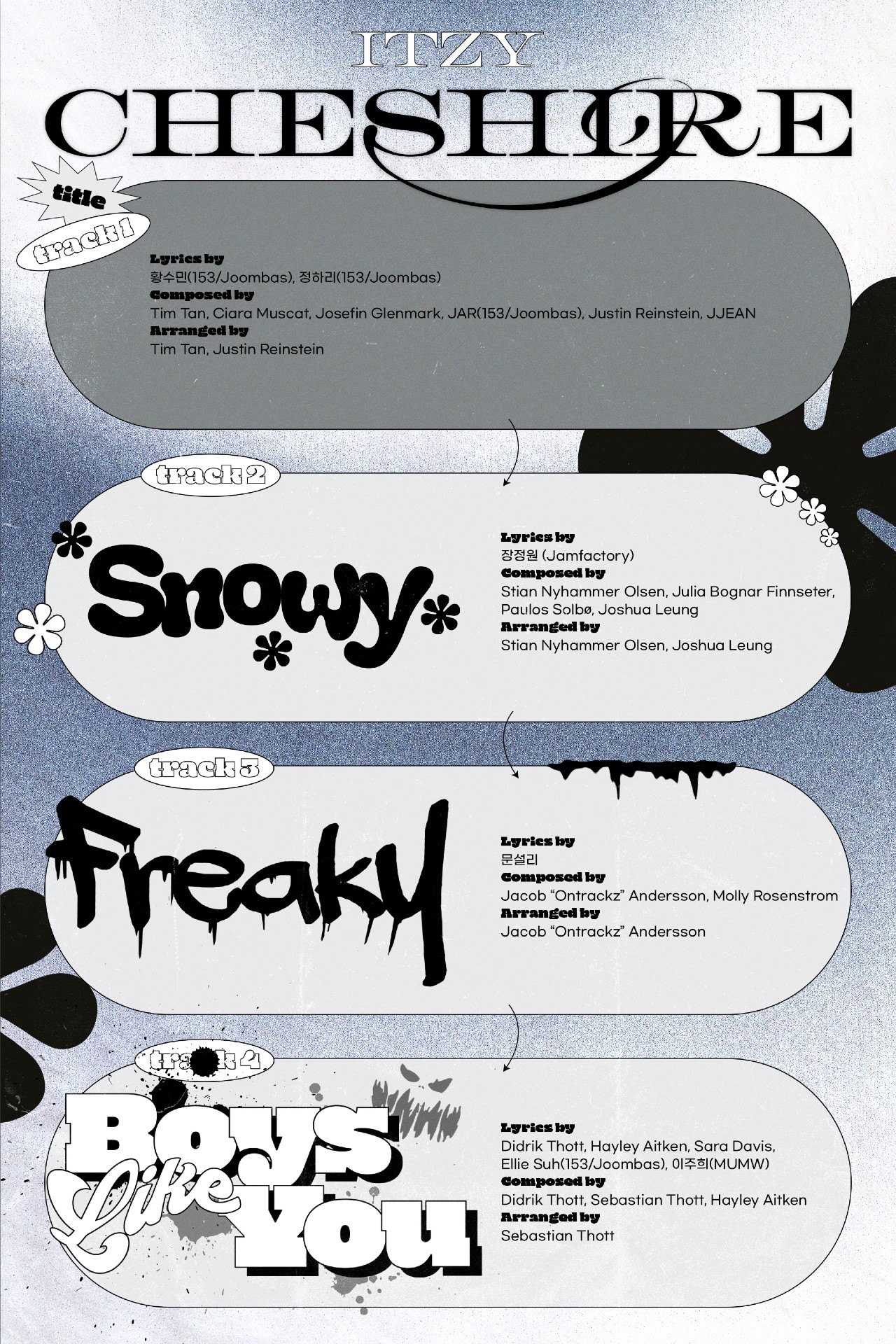 이에 따르면 신보에는 타이틀곡 ‘Cheshire’를 포함해 ‘Snowy'(스노위), ‘Freaky'(프리키), 10월 21일 발표한 선공개 영어 싱글 ‘Boys Like You'(보이즈 라이크 유)까지 총 4트랙이 수록된다. ITZY에게 미국 빌보드 차트 자체 최고 성적을 안긴 미니 5집 ‘CHECKMATE'(체크메이트)의 타이틀곡 ‘SNEAKERS'(스니커즈)를 함께 작업한 스웨덴 작곡가 디드릭 토트(Didrik Thott), 세바스티안 토트(Sebastian Thott)를 비롯해 글로벌 작가진이 크레디트를 수놓았다.