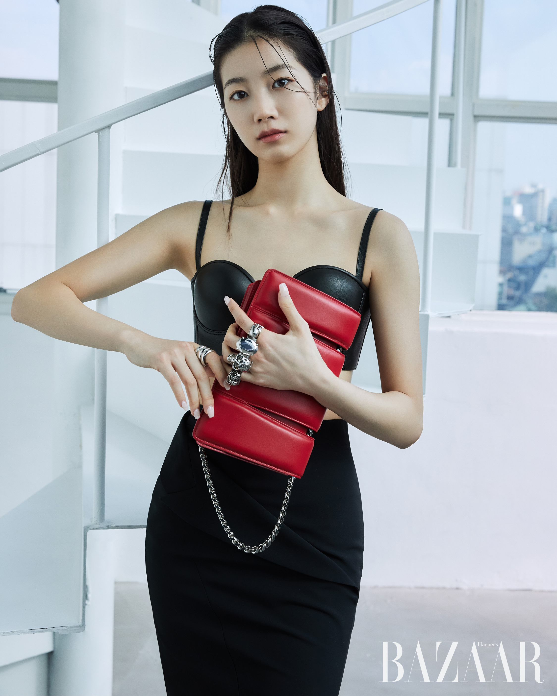 여름 프리 컬렉션에서 새롭게 선보이는 슬래쉬 백과 주얼 호보 백은 카즈하의 부드러운 카리스마를 한층 돋보이게 했다