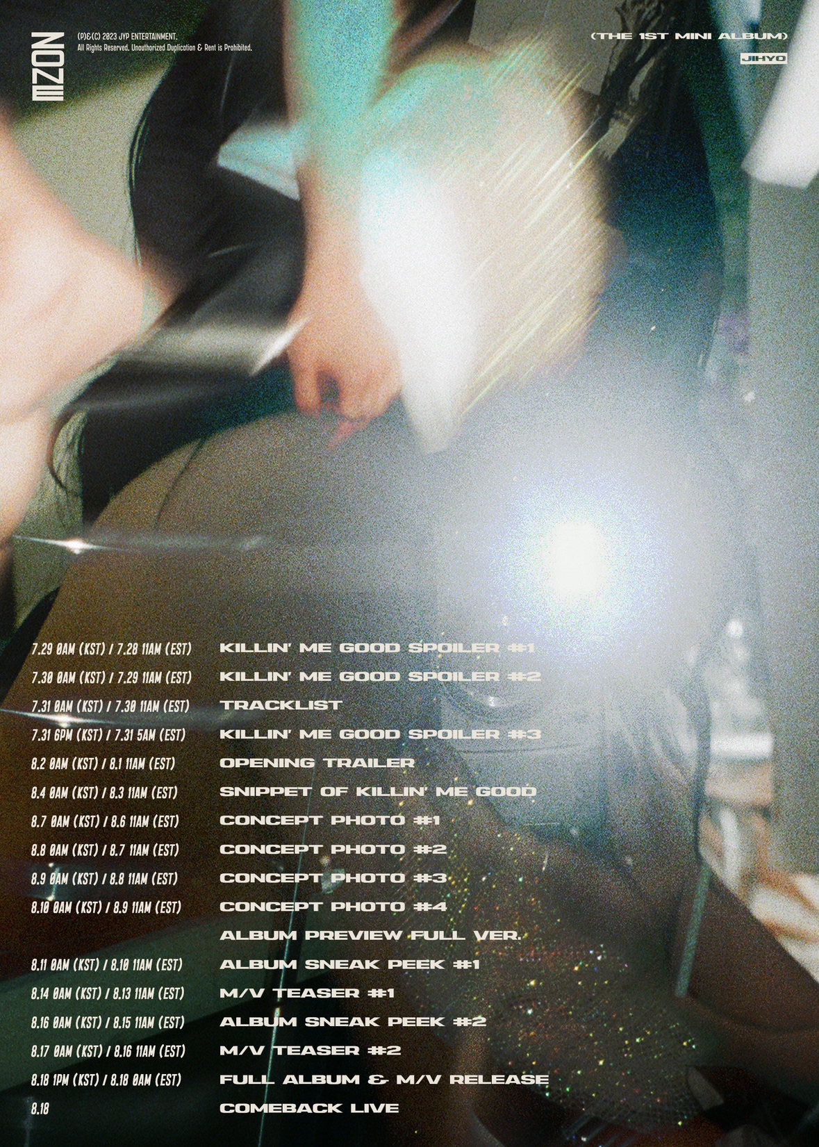 공개된 타임테이블에는 3주간의 꽉 찬 티징 일정이 담겨 글로벌 원스(팬덤명: ONCE)를 기쁘게 했다. 지효는 7월 29일부터 31일까지 타이틀곡 ‘Killin’ Me Good'(킬링 미 굿)을 미리 만나는 스포일러를 시작으로 31일 트랙리스트, 8월 2일 오프닝 트레일러, 4일 ‘Killin’ Me Good’의 스니펫, 7일부터 10일까지 콘셉트 포토, 11일과 16일 앨범 스니크 피크, 14일과 17일 뮤직비디오 티저를 차례로 선보인다. 앨범 발매 당일인 18일에는 컴백 라이브를 진행하고 팬들과 만난다.