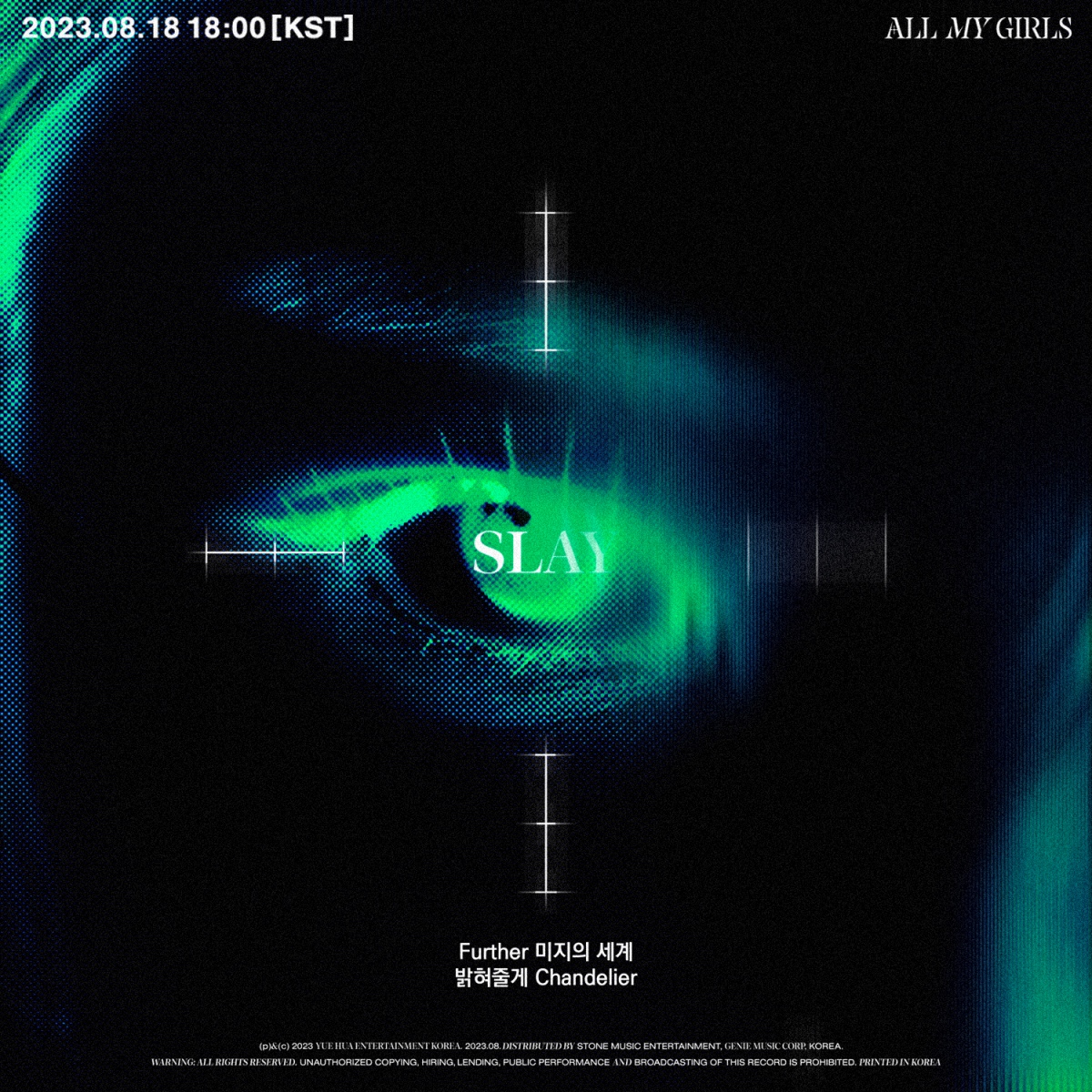 먼저 첫 번째 포스터에는 강렬한 초록색 눈동자 이미지와 함께 타이틀곡 ‘SLAY(슬레이)’의 가사 일부가 담겼다. “Further 미지의 세계 밝혀줄게 Chandelier”라는 가사를 통해 진취적이고 당당한 에버글로우만의 에너지를 느낄 수 있다.