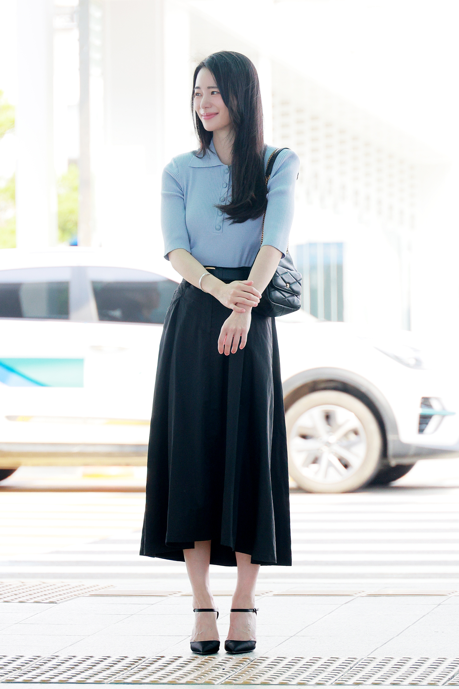 그녀는 청량감이 느껴지는 시슬리의 카라 니트와 벨트 디테일이 돋보이는 롱 스커트로 여름 데일리룩을 완성시켰다