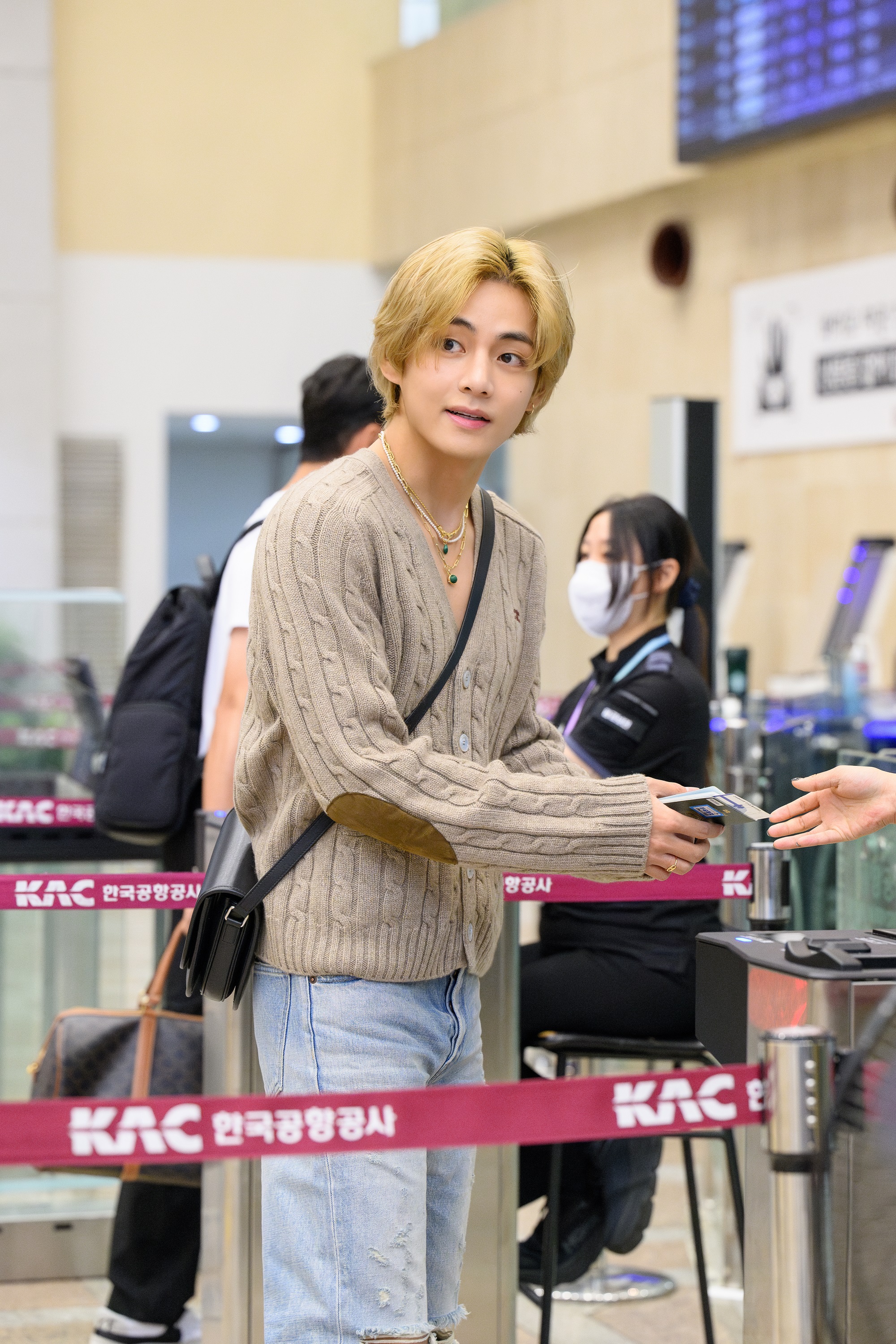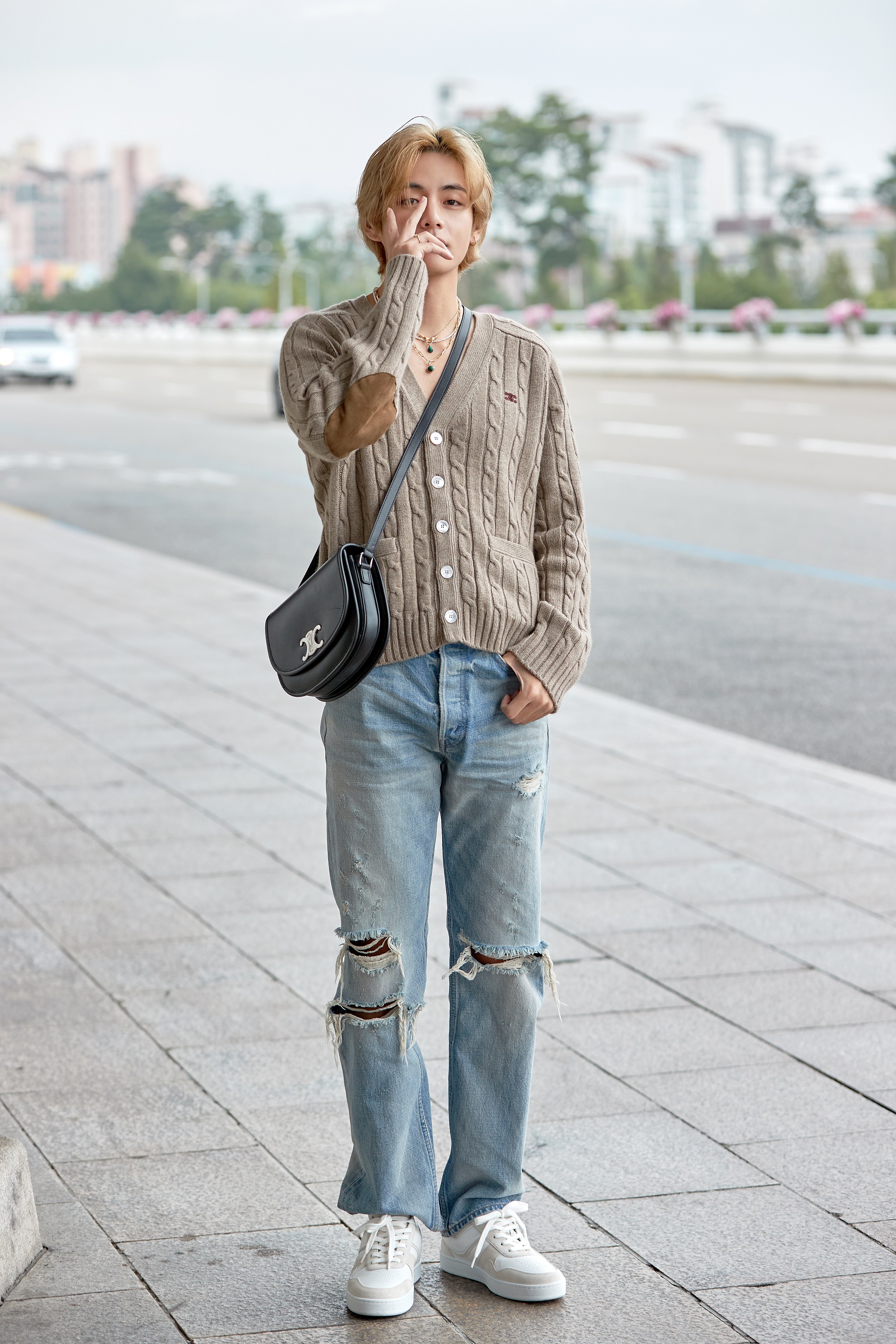 뷔는 부드러운 카프 가죽으로 정제되고 세련된 감성을 담은 베사체 백을 착용해 스타일 아이콘 다운 트렌디한 공항패션을 완성했다