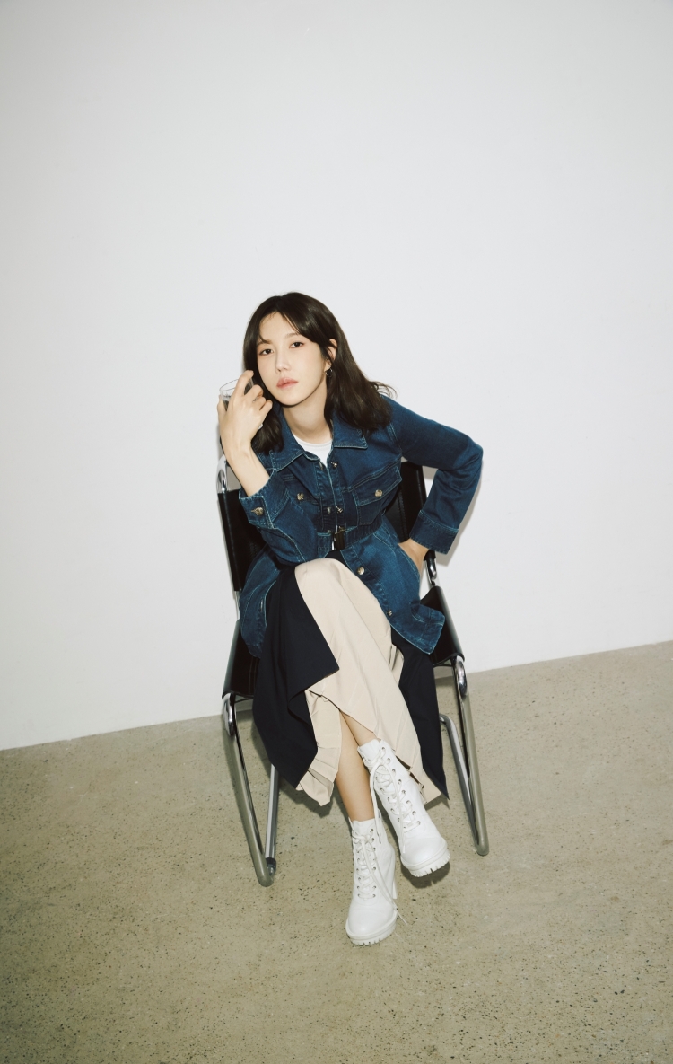 화보 속 이지아는 다이아 퀼팅이 돋보이는 레더 점퍼에 여성스러운 실루엣의 플레어 데님 스커트를 매치하고