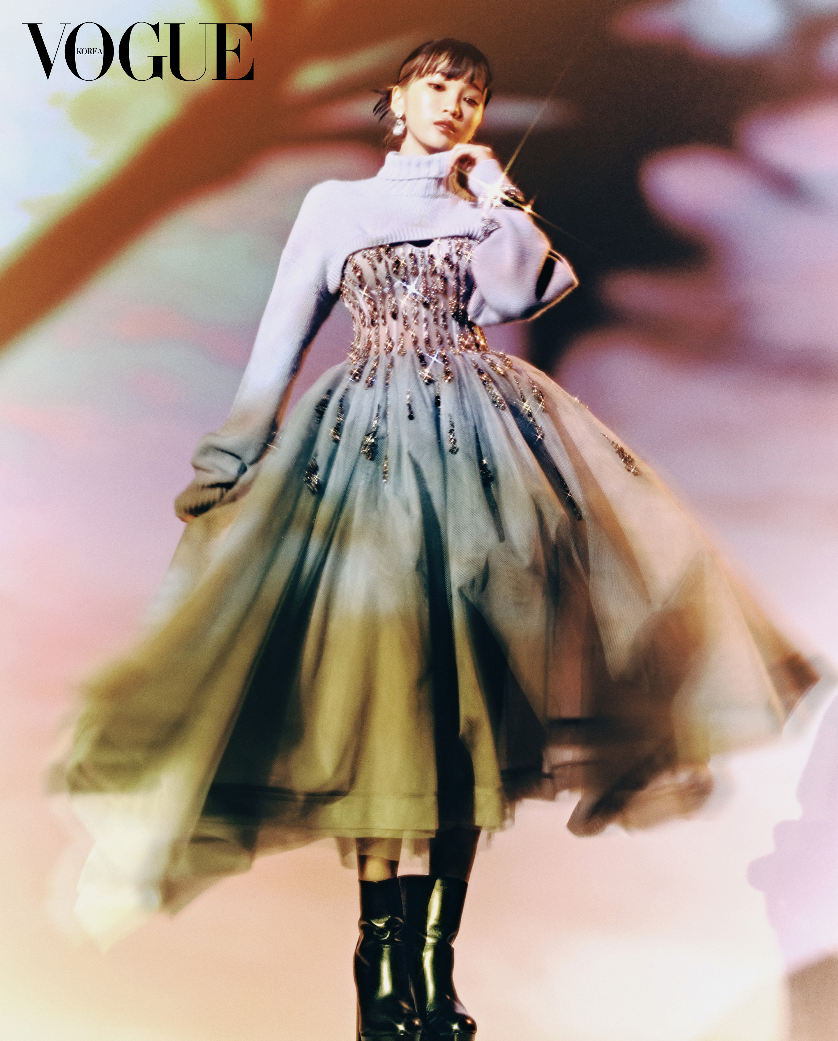 볼륨감 있는 소매가 특징인 절개 스웨터와 크리스탈이 별처럼 가득 수놓인 코르셋 드레스는 김채원의 아름다움을 극대화하는가 하면