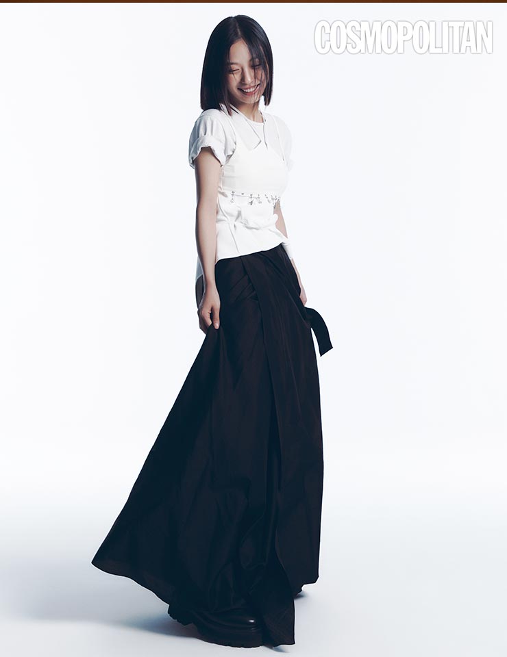블랙앤화이트 콘셉트로 미니멀하게 드레스업한 고민시는 때로는 강렬하게