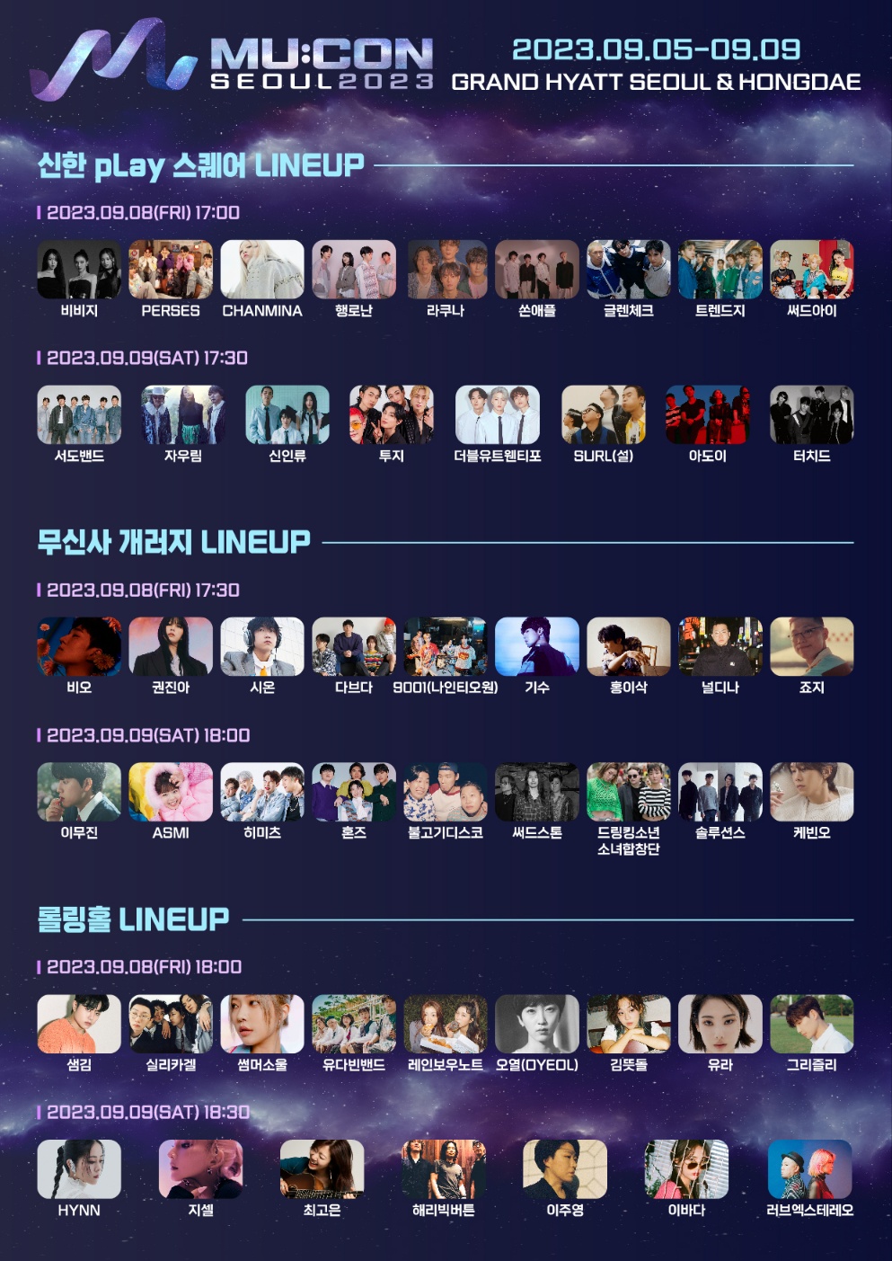 먼저 쇼케이스는 9월 8일과 9일 양일간 홍대 ▲신한 pLay 스퀘어 라이브홀 ▲무신사 개러지 ▲롤링홀 등 세 곳에서 진행된다. 팝부터 R&B, 락, 힙합, 일렉트로닉 등 다양한 장르의 참가 뮤지션 40팀과 게스트 뮤지션 8팀, 해외 뮤지션 3팀 등 총 51개 팀이 무대에 오른다.