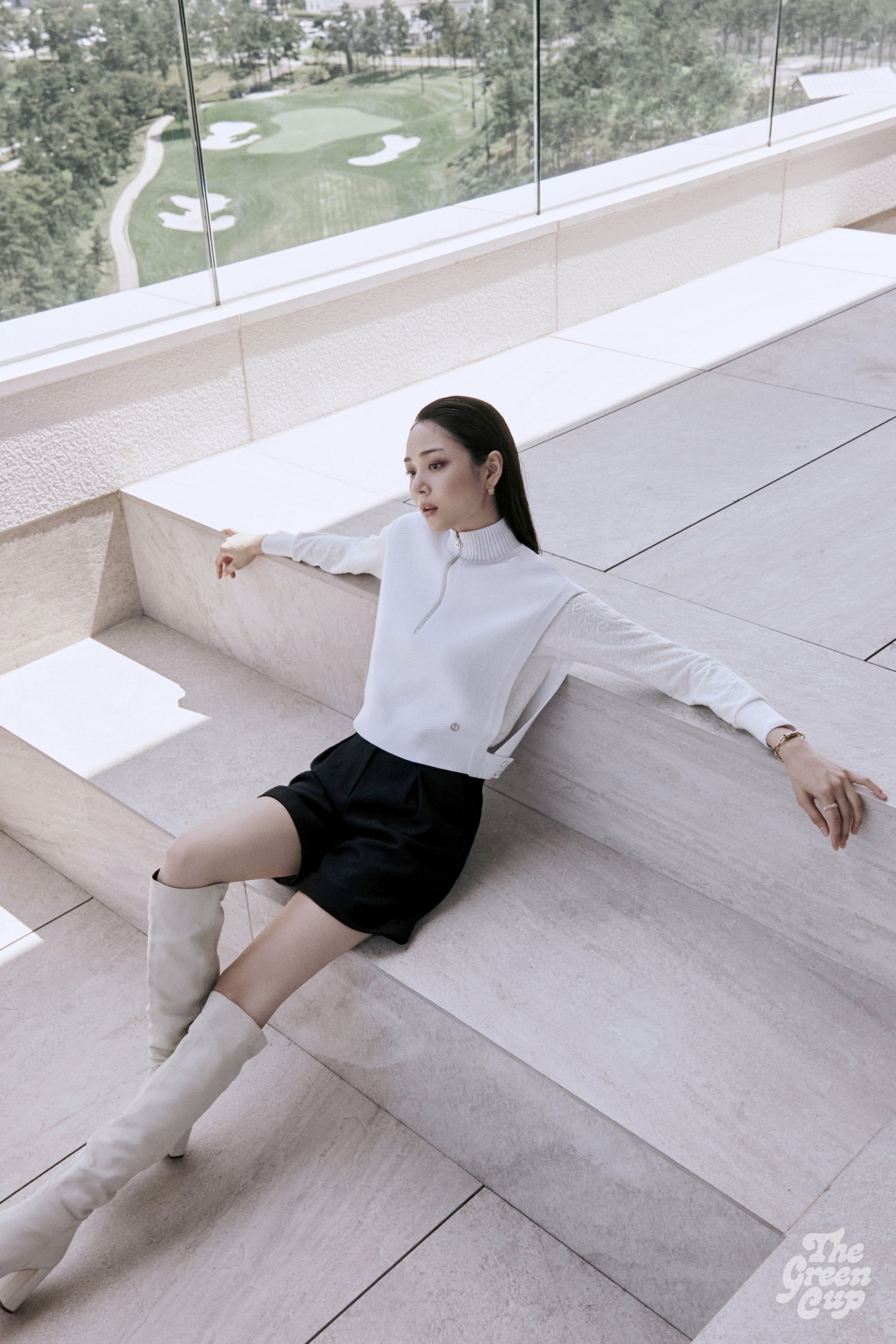 를 은은한 컬러의 자가드 폴로 셔츠와 함께 하여 심플하고 고급스러운 룩을 선보이기도 하고