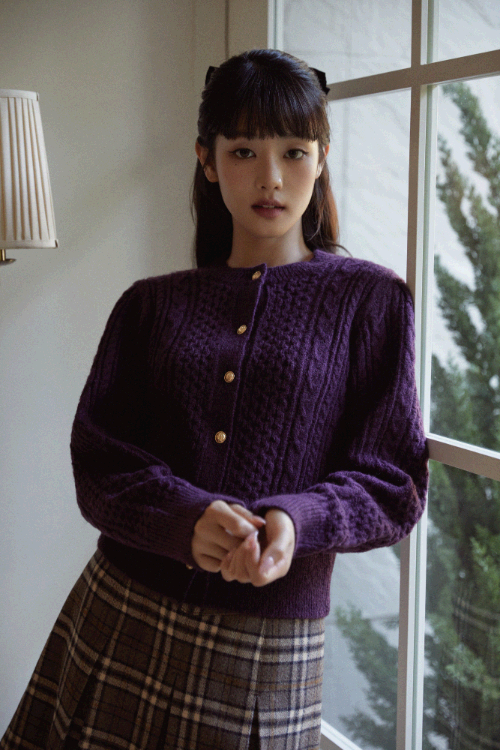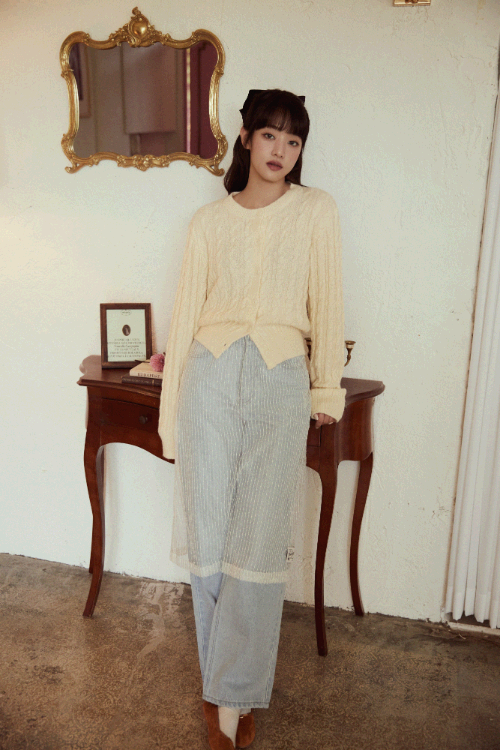 넥 가디건은 어깨부터 손목까지 이어지는 소매 라인과 옆선을 케이블 패턴으로 처리해 볼륨감을 살리고