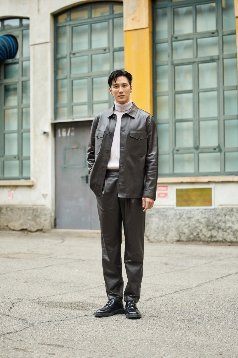 겨울 컬렉션 브라운 레더 셔츠 자켓과 팬츠로 특유의 남성스러운 매력을 드러냈으며