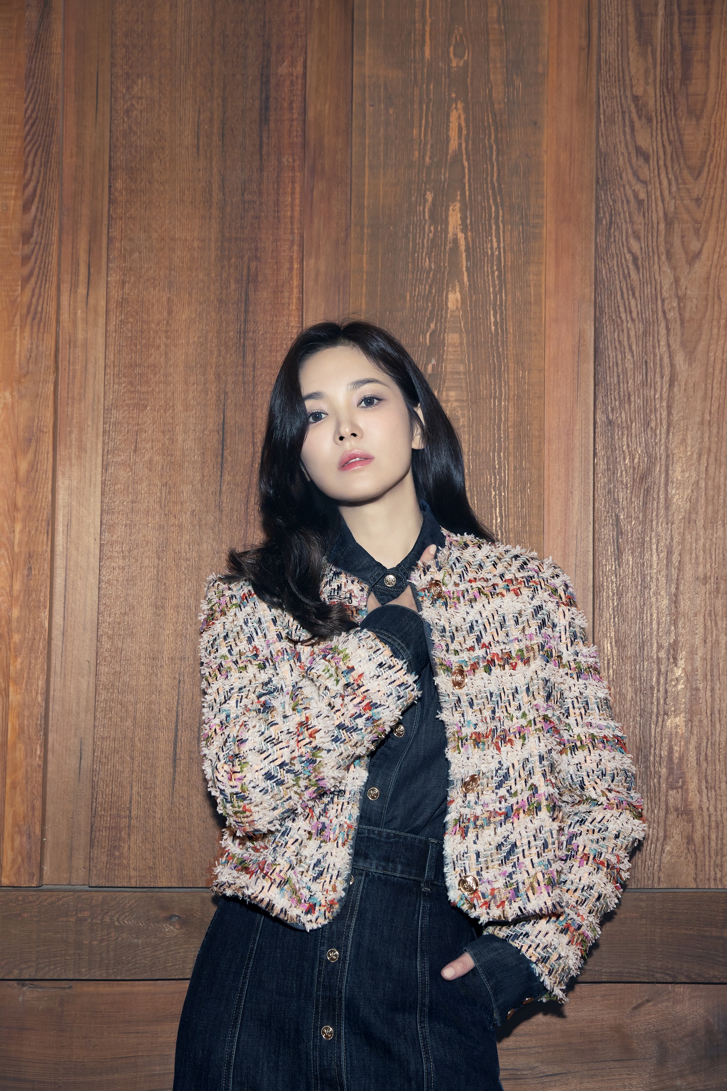 이 외에도 여러 컬러의 원사들이 다채롭게 짜인 트위드 자켓과 데님 블라우스
