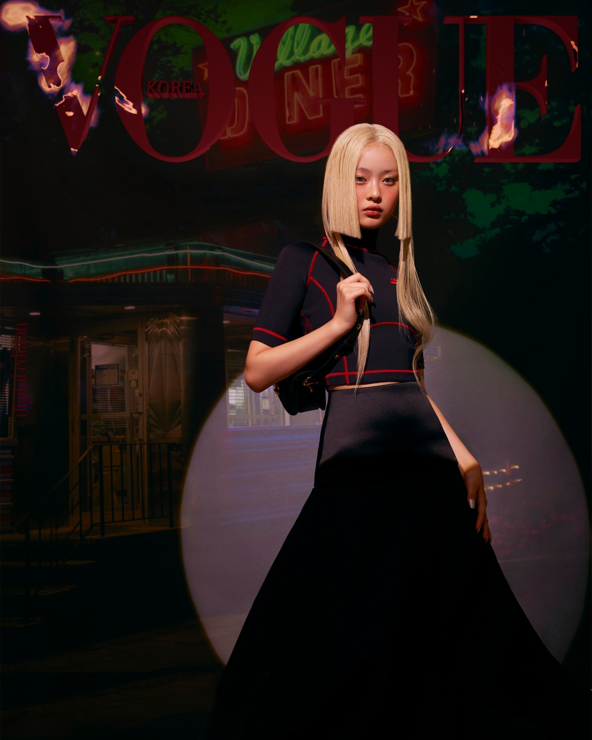 화보 안에서 리노는 구찌 프린트와 패치 디테일이 돋보이는 블랙 티셔츠에 인터로킹