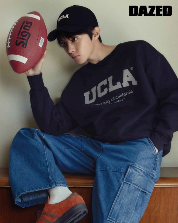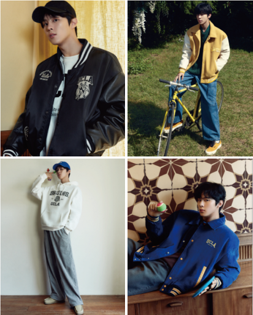 바시티 재킷을 김우석 특유의 청량미 넘치는 소년미와 장난기 넘치는 모습으로 소화해 시선을 사로잡았다