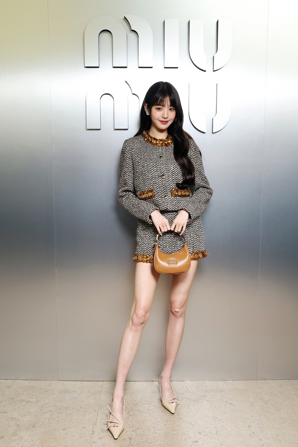장원영은 부클레 소재의 트위드 셋업 스타일링에 미니 소프트 카프 백을 매치해 트렌디한 패션을 뽐냈다