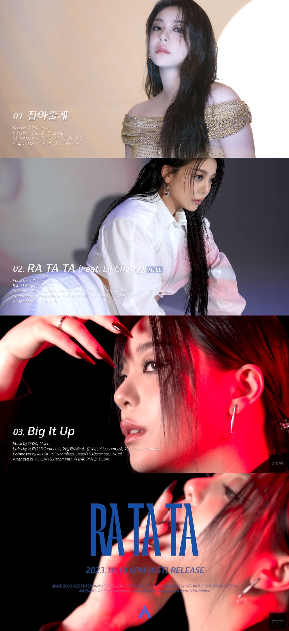 ‘RA TA TA’에는 지난달 발매한 싱글 ‘잡아줄게’와 타이틀곡 ‘RA TA TA (Feat. Lil Cherry)’, ‘Big It Up’이 수록됐다. 에일리는 하이라이트 메들리 영상을 통해 3개의 음원을 일부 공개하며 완성도 높은 신보로 돌아올 것을 예고했고, 재킷 촬영 현장에서 프로페셔널한 모습을 보이며 보는 이들의 감탄을 불러일으켰다.