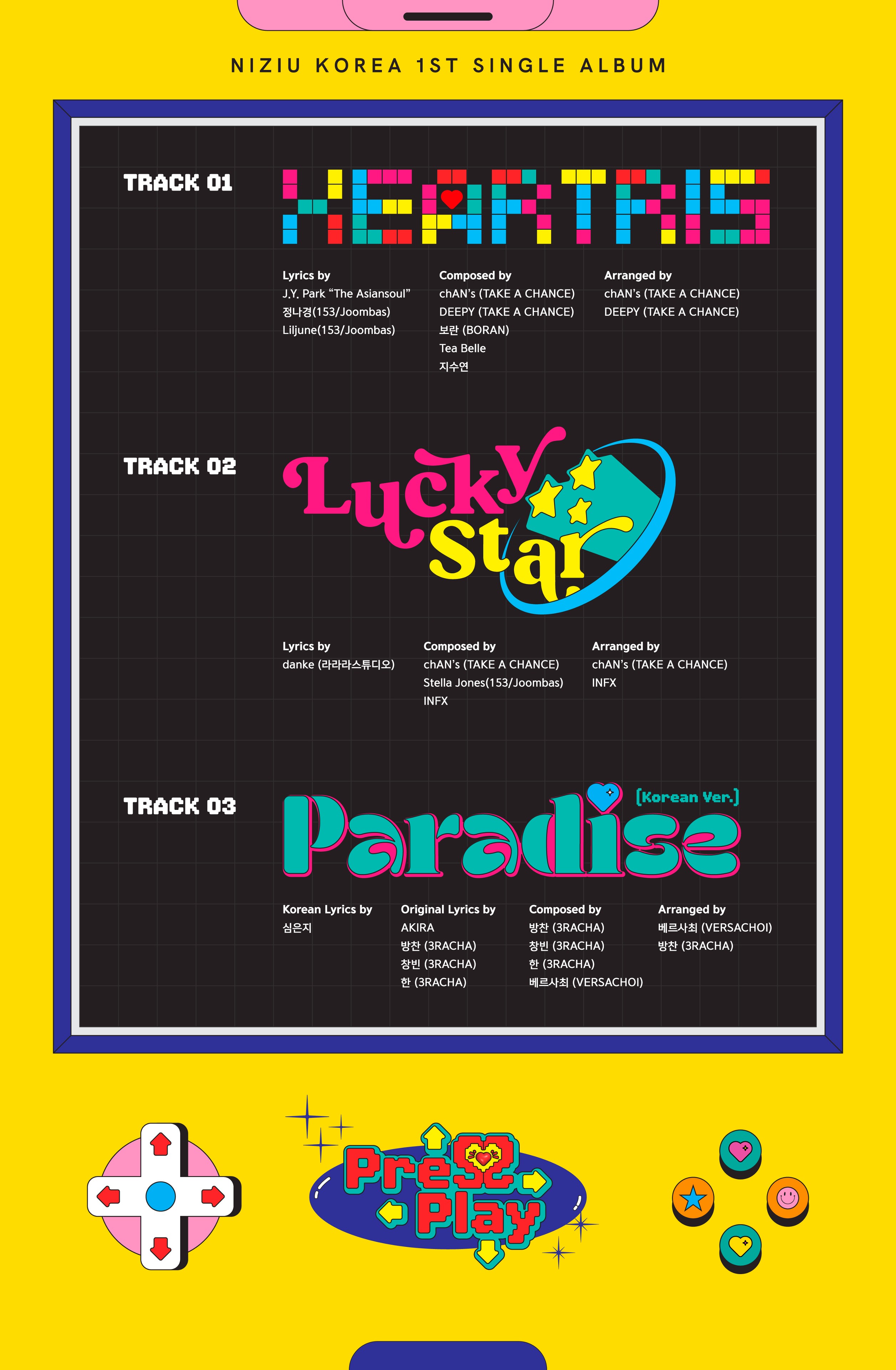 아기자기한 아이콘이 자리한 트랙리스트에 따르면 국내 첫 앨범 ‘Press Play’에는 타이틀곡 ‘HEARTRIS’를 포함해 ‘Lucky Star'(럭키 스타), ‘Paradise (Korean Ver.)'(파라다이스 한국어 버전)까지 총 3곡이 실린다. 특히 ‘HEARTRIS’는 JYP 대표 프로듀서 박진영이 작사에 참여해 그룹 특유의 밝은 에너지와 사랑스러운 매력을 살려 가사를 완성했다.