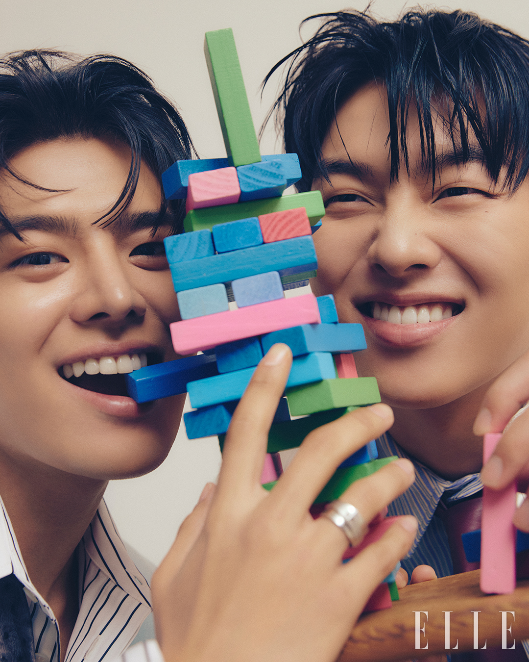드라마 <반짝이는 워터멜론>의 두 주인공 려운과 최현욱이 <엘르>와 만났다. ‘코다(CODA; 청각장애인 양육자를 둔 청인)’인 고등학생 은결(려운)이 과거로 회귀해 10대 시절의 아버지 이찬(최현욱)과 함께 밴드를 만든다는 드라마 속 내용에 따라 화보 촬영은 활기차고 유쾌한 콘셉트로 진행됐다.