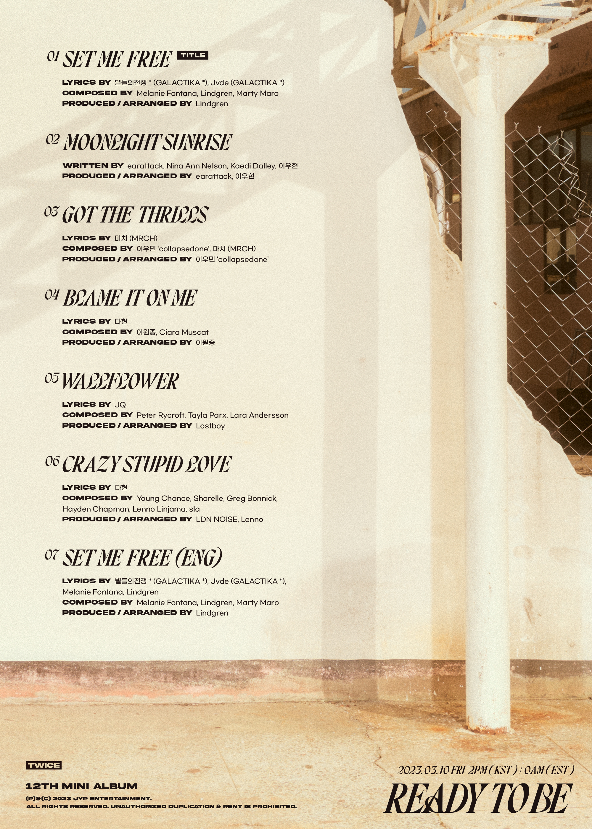 트랙리스트에 따르면 트와이스 미니 12집에는 미국 빌보드 메인 차트 ‘핫 100’ 진입에 빛나는 선공개 영어 싱글 ‘MOONLIGHT SUNRISE'(문라이트 선라이즈)를 포함해 ‘GOT THE THRILLS'(갓 더 쓰릴스), ‘BLAME IT ON ME'(블레임 잇 온 미), ‘WALLFLOWER'(월플라워), ‘CRAZY STUPID LOVE'(크레이지 스투피드 러브), 타이틀곡 ‘SET ME FREE’ 그리고 타이틀곡의 영어 버전까지 총 7트랙이 수록된다.