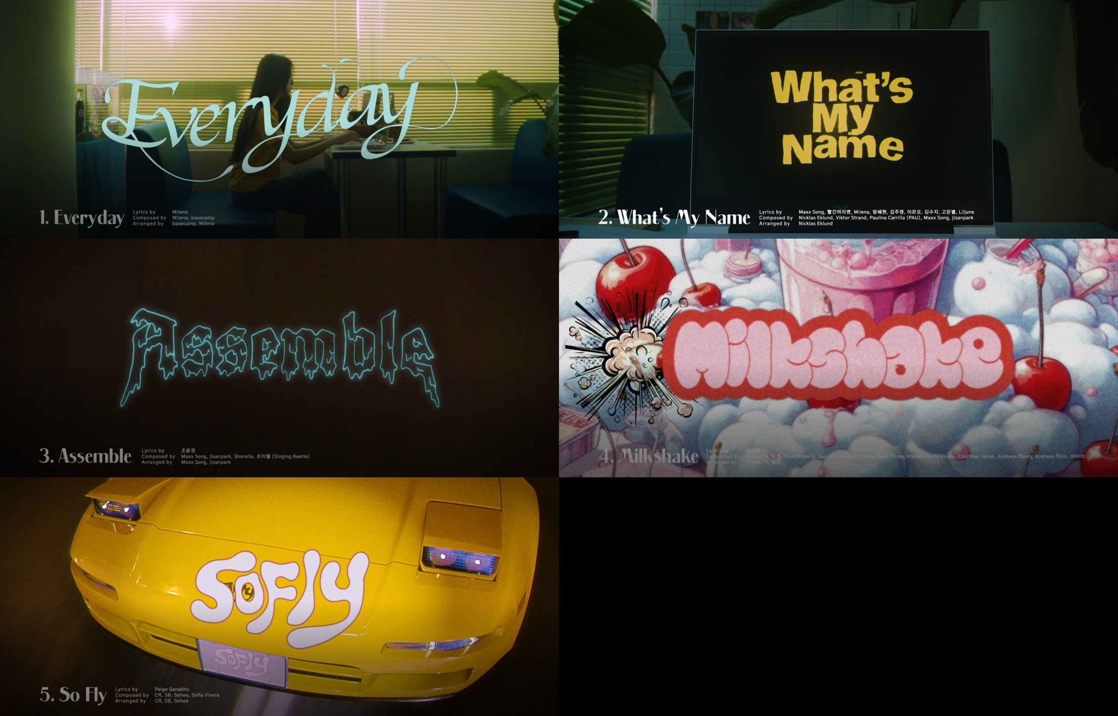 이밖에 몽환적인 매력이 돋보이는 1번 트랙 ‘Everyday'(에브리데이)와 일렉트로닉 기반의 ‘Assemble'(어셈블), 리드미컬하고 키치한 ‘Milkshake'(밀크셰이크), 감성 보컬로 장식한 마지막 곡 ‘So Fly'(소 플라이)까지 5곡 5색의 매력이 완곡에 대한 기대감을 높인다.