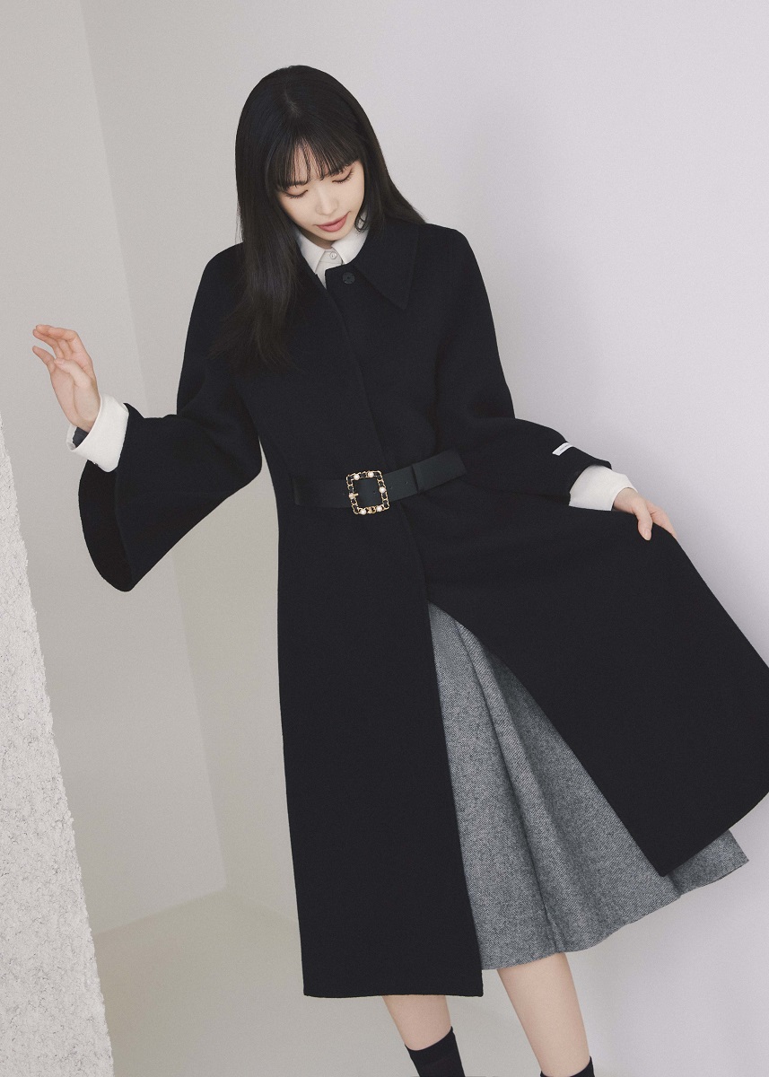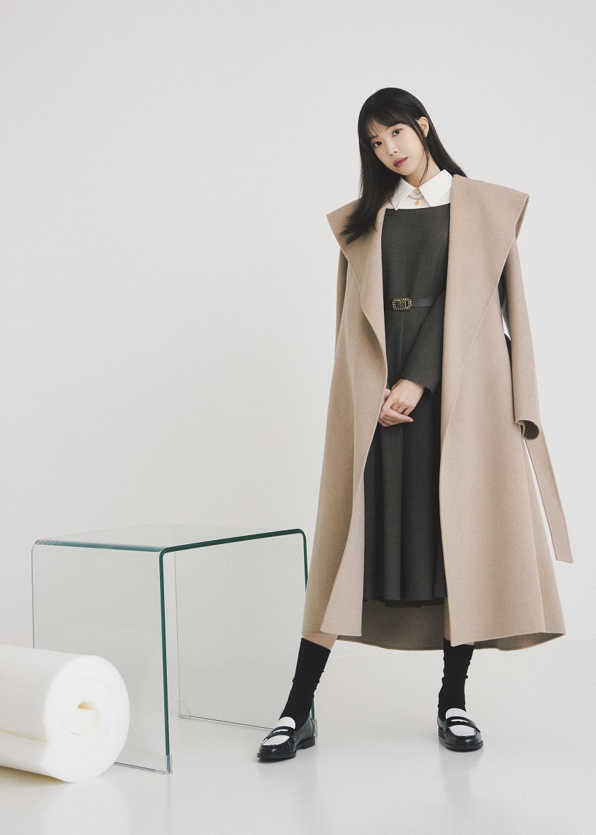 또한 허리 벨트가 우아하면서도 차분한 분위기를 연출하는 원피스와 울 핸드메이드 코트를 함께 매치해