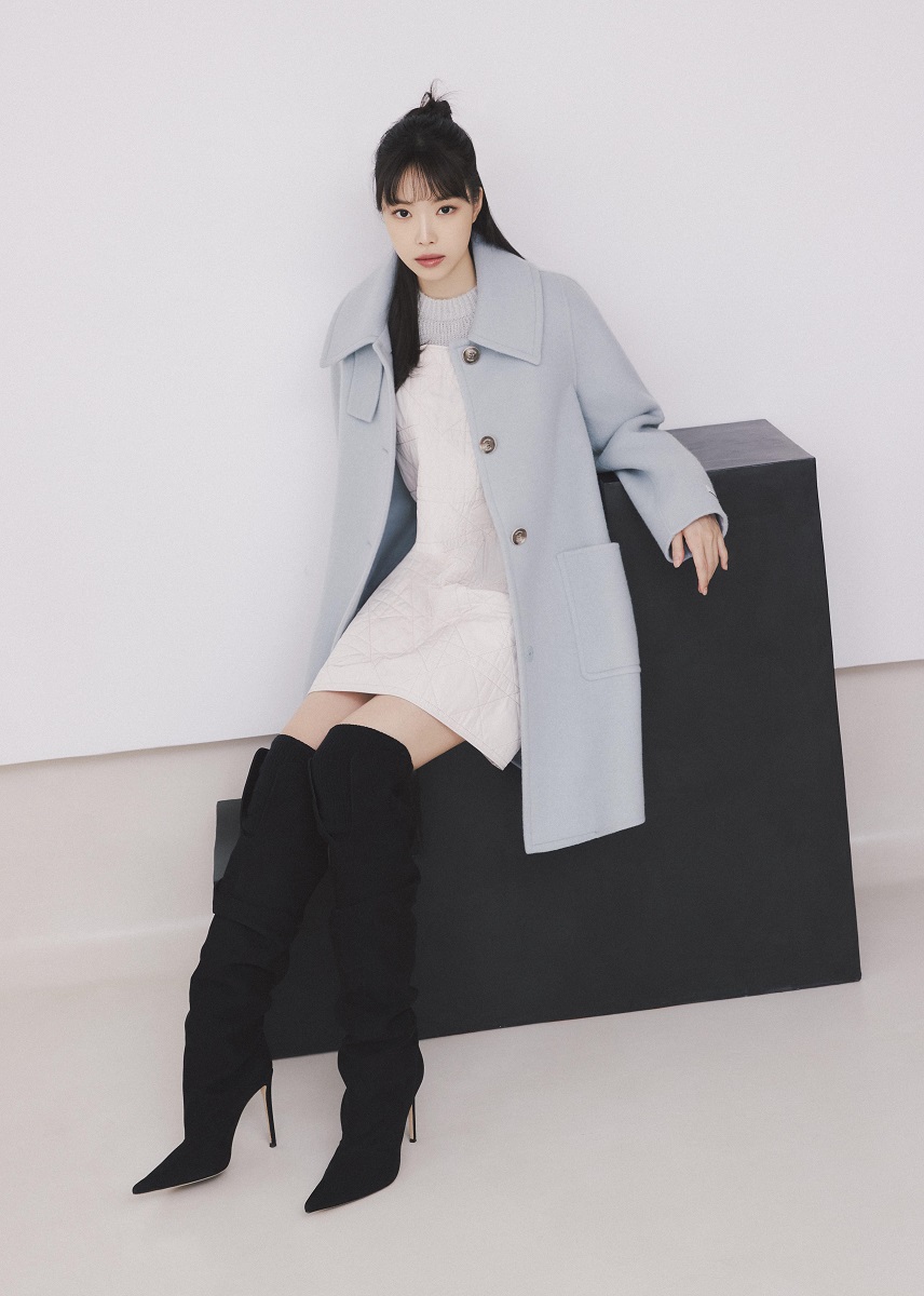다른 화보에서는 파스텔 블루의 트위드 원피스와 폭스 퍼 칼라로 포인트를 줄 뿐만 아니라 부드러운 양모 소재로
