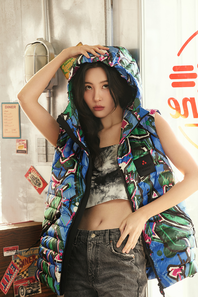 라인으로 퍼지는 사이드 지퍼 디테일과 후드 깃이 돋보이는 패딩 베스트를 착용해 우아하면서도 럭셔리한 봄 스타일링을 제안했다