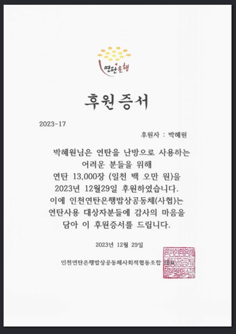 HYNN(박혜원)은 자신의 인스타그램을 통해 “데뷔 5주년을 기념하는 흰즈들의 기부와 연탄 봉사에 동참합니다. 추운 겨울 조금이나마 보탬이 될 수 있기를 바랍니다. 따뜻한 연말 보내세요”라는 글을 게재했다. 이와 함께 인천 연탄은행 밥상 공동체 사회적 협동조합으로부터 받은 후원 증서까지 공개하며 훈훈함을 더했다.