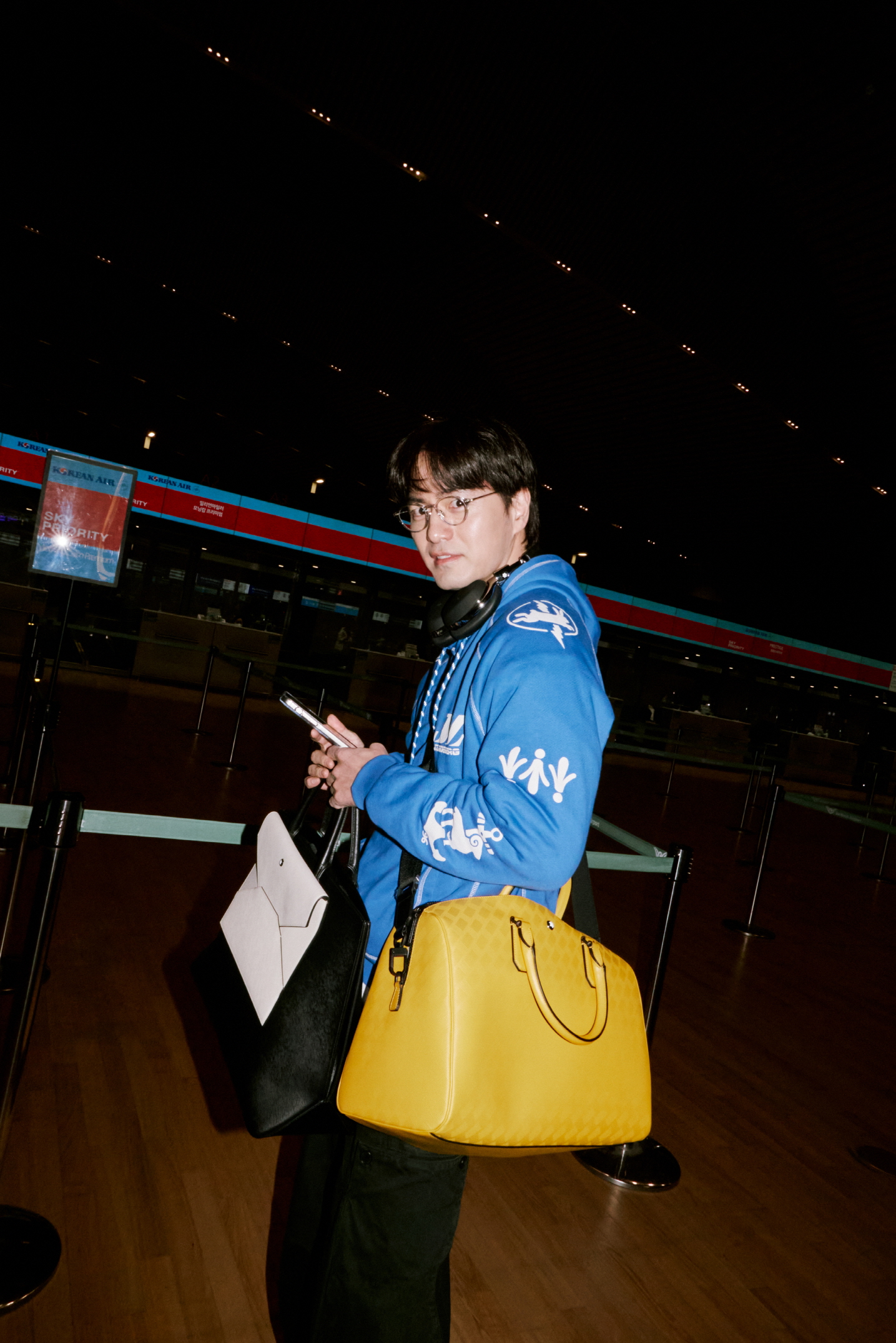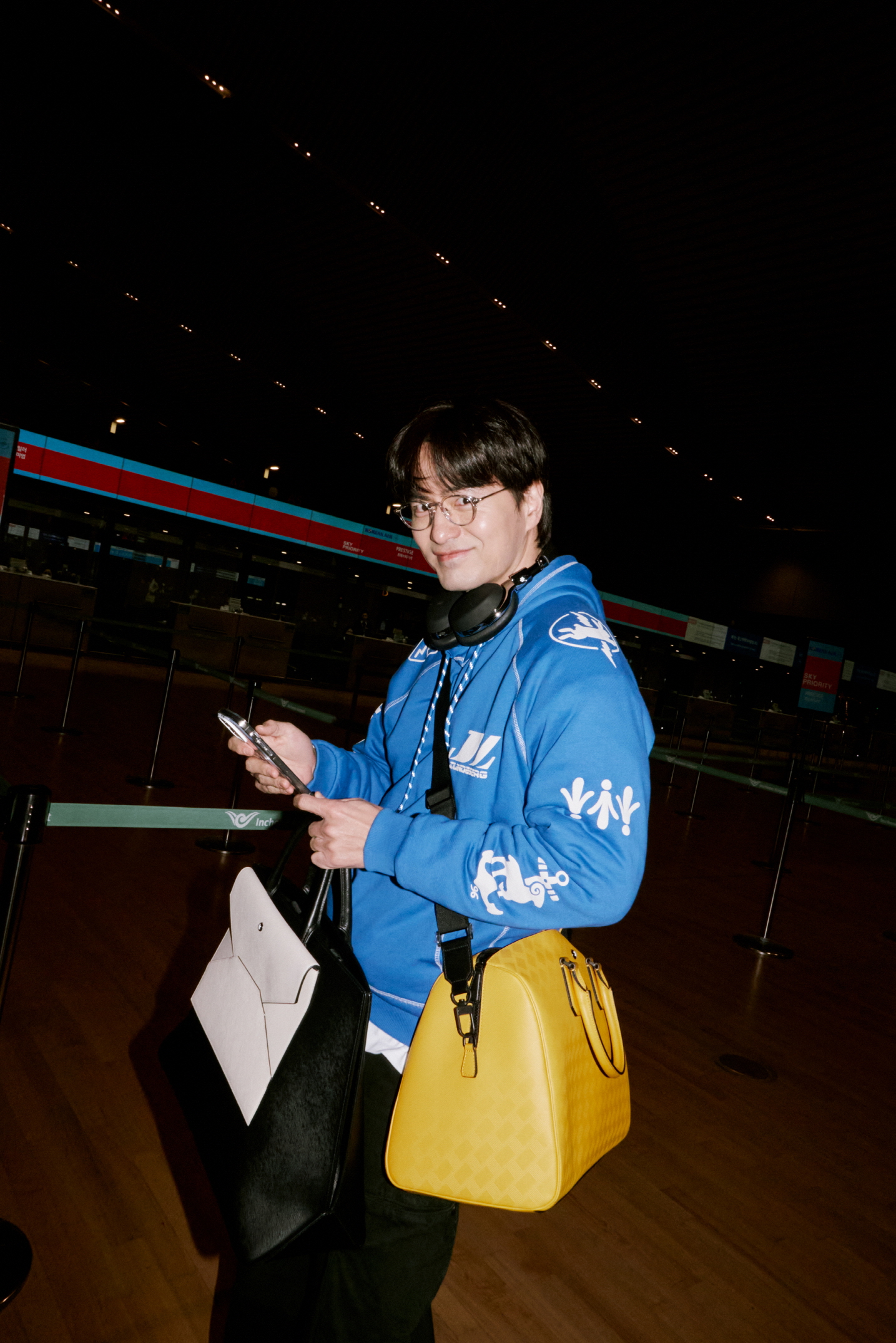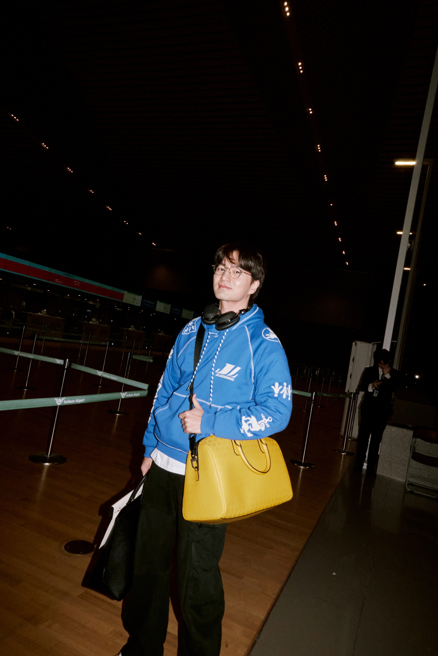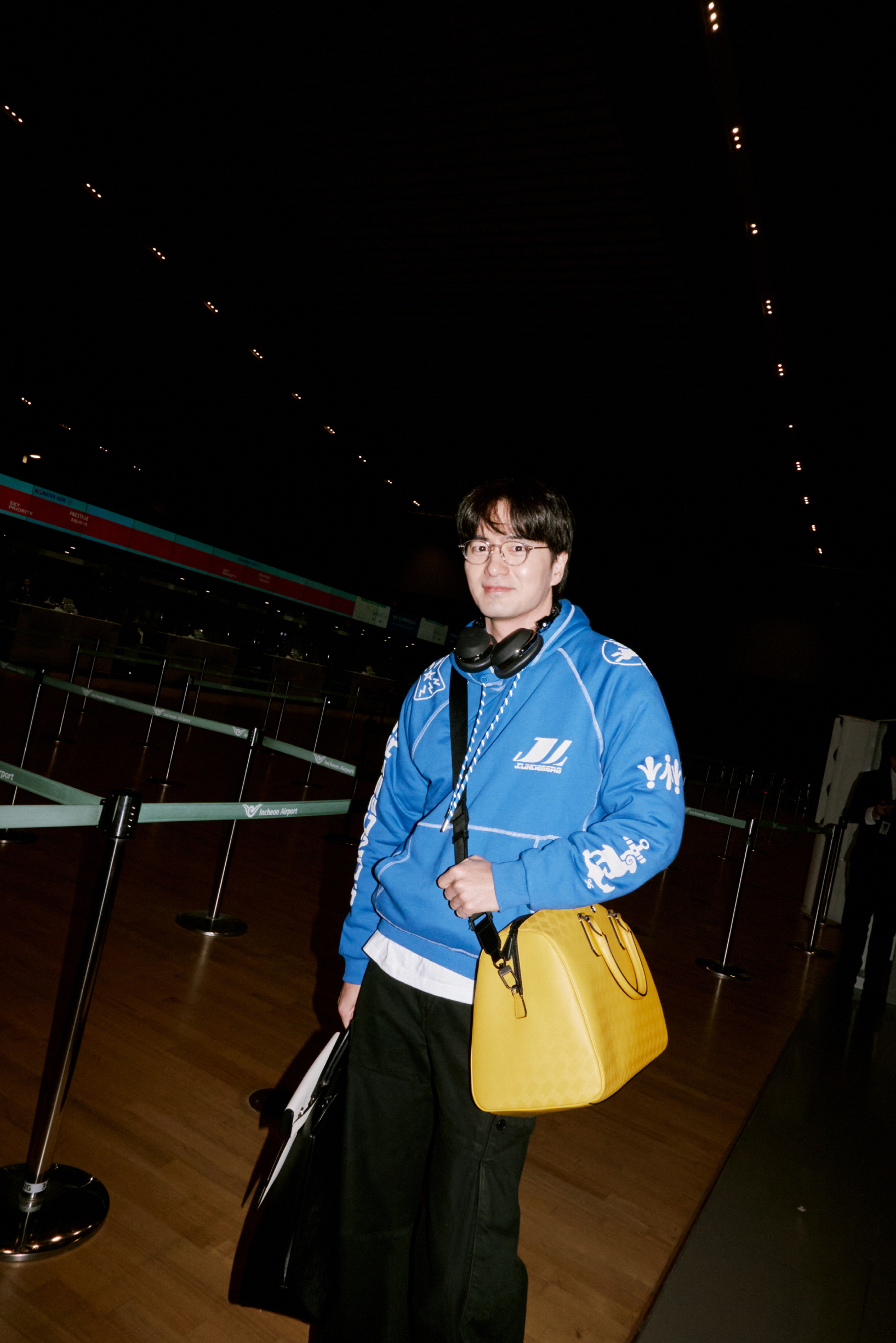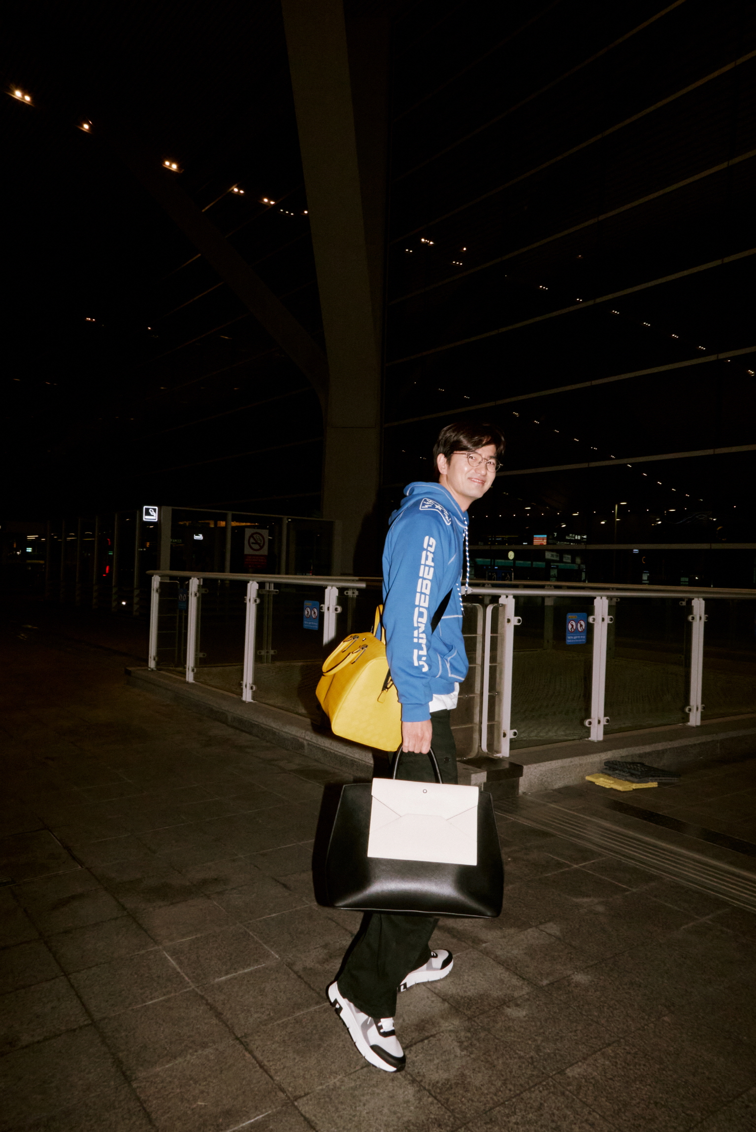 공항에 도착한 이진욱은 웜 옐로 컬러의 보스턴 백으로 포인트를 주어 산뜻한 스타일링을 연출했다. 이진욱이 착용한 몽블랑