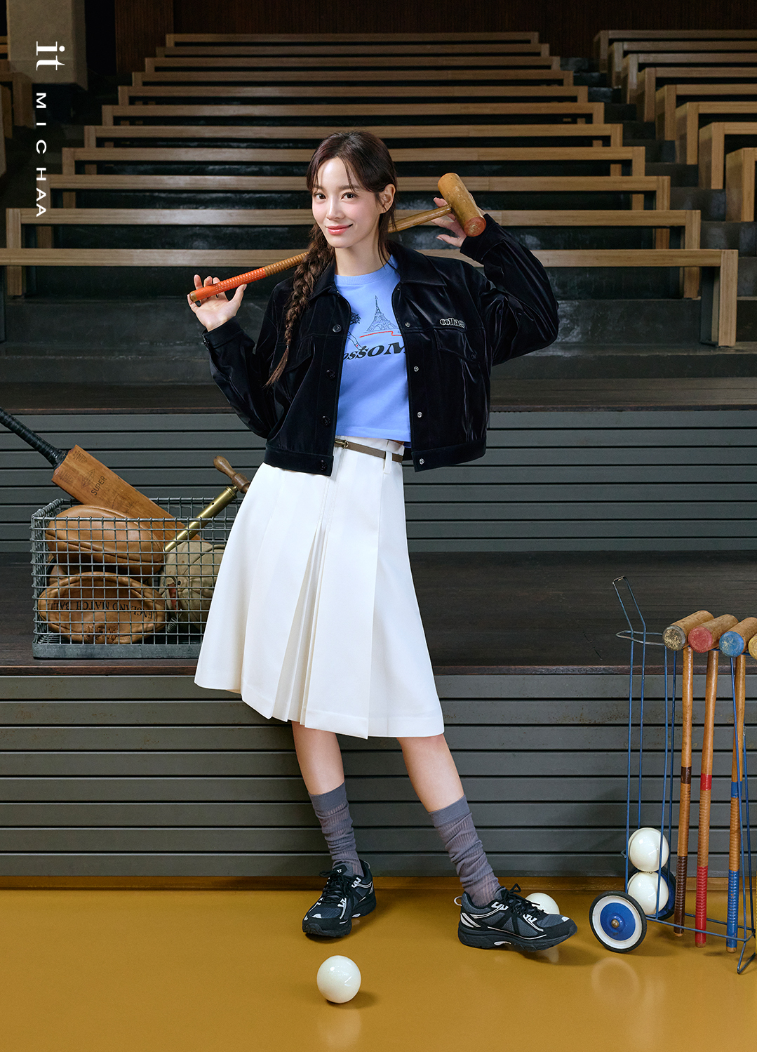 미들 기장의 플리츠 스커트에 캐주얼한 점퍼를 매치해 트렌디한 데일리 웨어를 선보였다