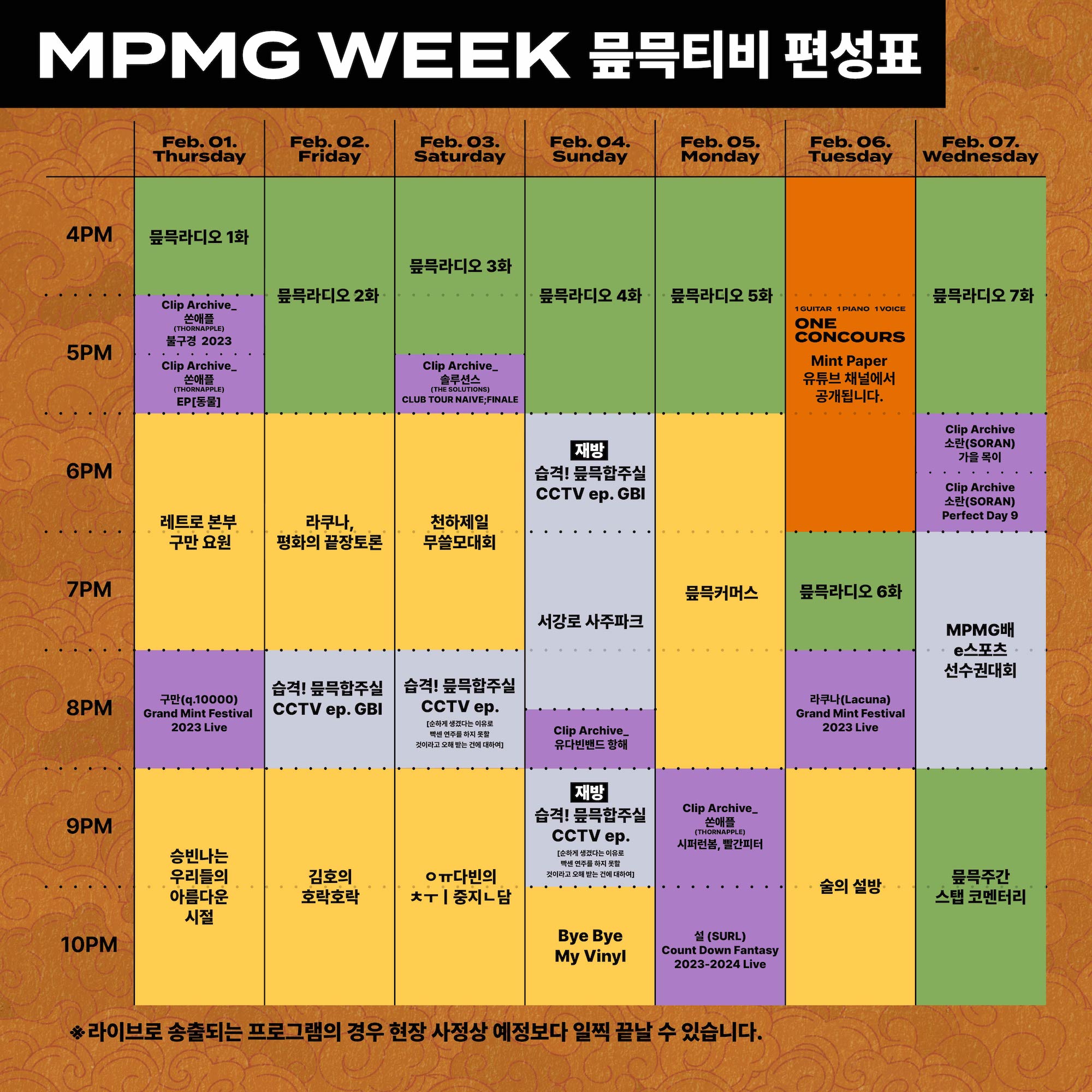 특히 눈길을 끈 것은 엠피엠지 위크 기간을 꽉 채운 ‘??티비’ 편성표이다. ‘??티비’는 온라인 송출 프로그램으로, 일주일 동안 매일 오후 4시부터 11시까지 MPMG 유튜브 채널에서 시청할 수 있다.