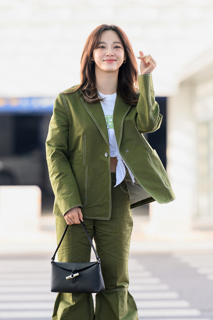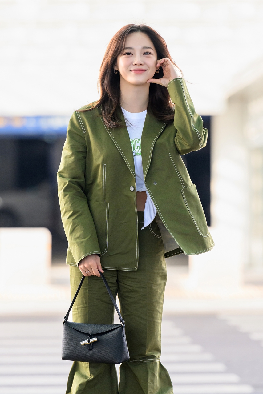 컬렉션의 자켓과 팬츠 셋업 룩에 클로그 슈즈 그리고 로조 호보 백으로 포인트를 주며 센스 있는 파리지앵 시크 감성의 공항패션을 완성했다