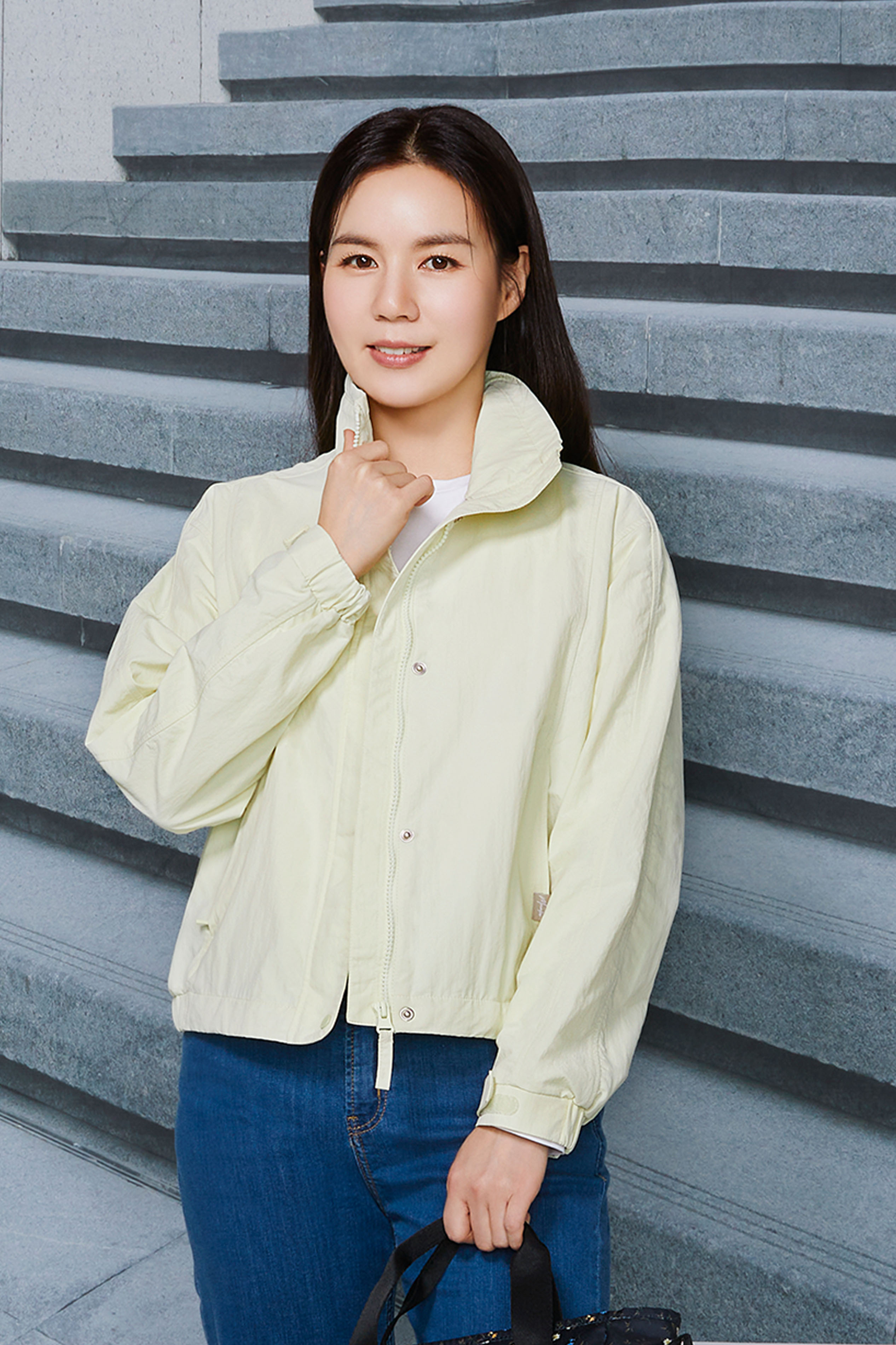 박시은은 라벤더 색상을 착용해 화사한 무드를 살린 윈드 브레이커 커플 아웃도어 룩을 선보였다