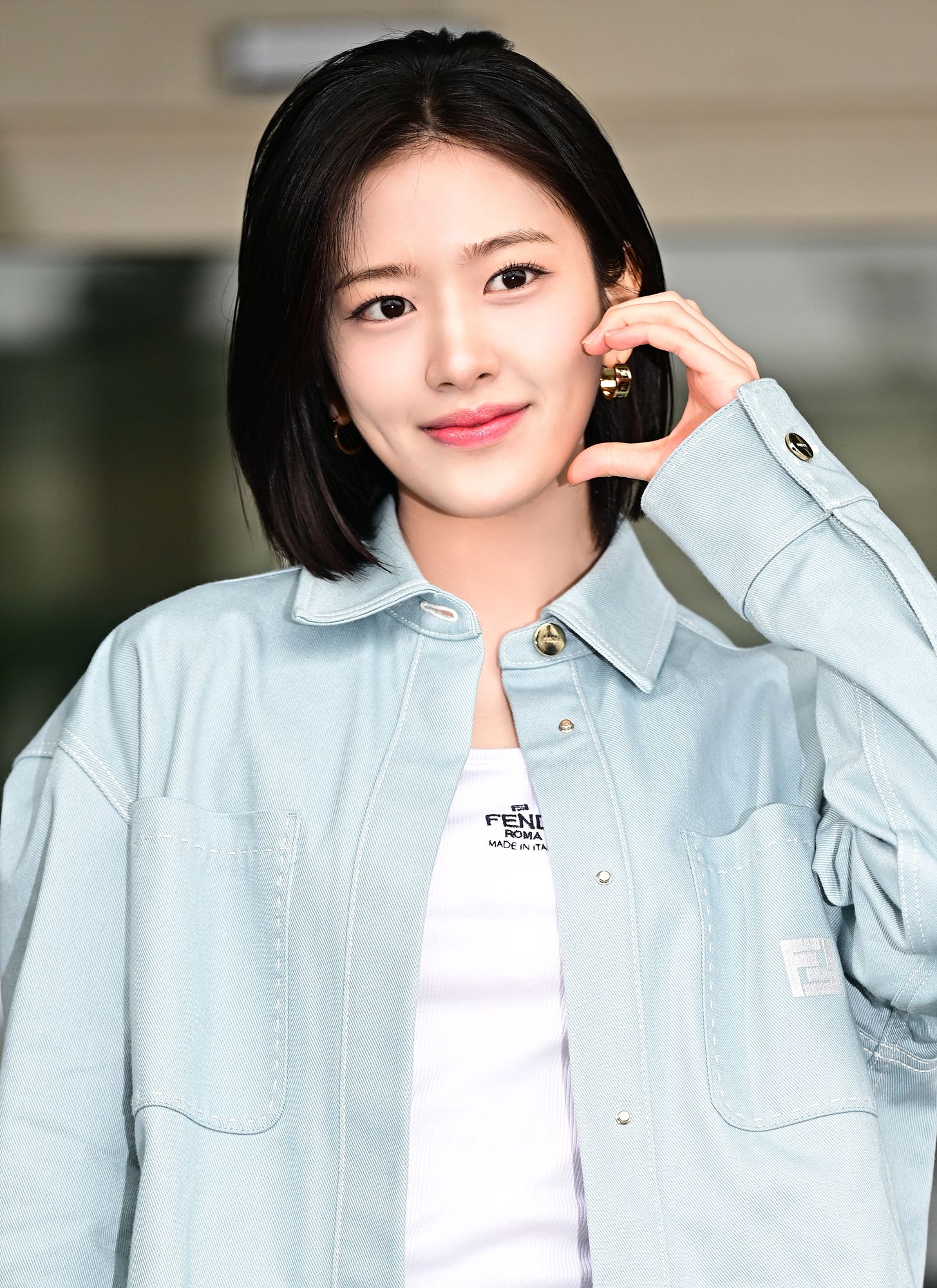 펜디 앰버서더인 안유진은 펜디의 화이트 코튼 탑에 라이트 블루 컬러의 데님 고 투 재킷을 걸쳐 산뜻한 무드의 공항패션을 선보였다