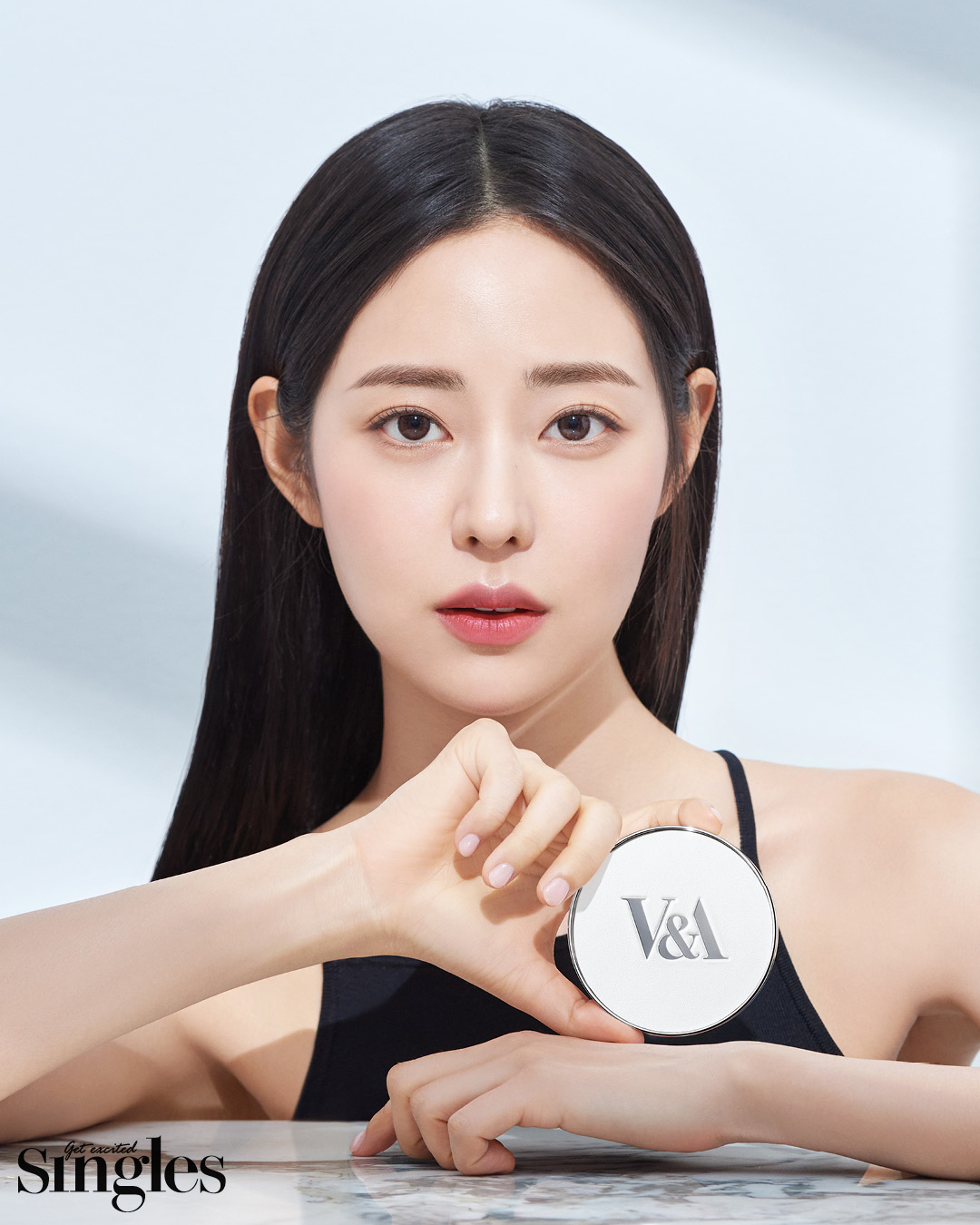 또 다른 화보에서 신슬기는 블랙 슬리브리스의 드레스에 V&A 롱 웨어 쿠션 파운데이션 매트를 사용해 더욱 고급스러운 피부 표현을 연출해 한층 더 성숙한 분위기를 자아냈다.