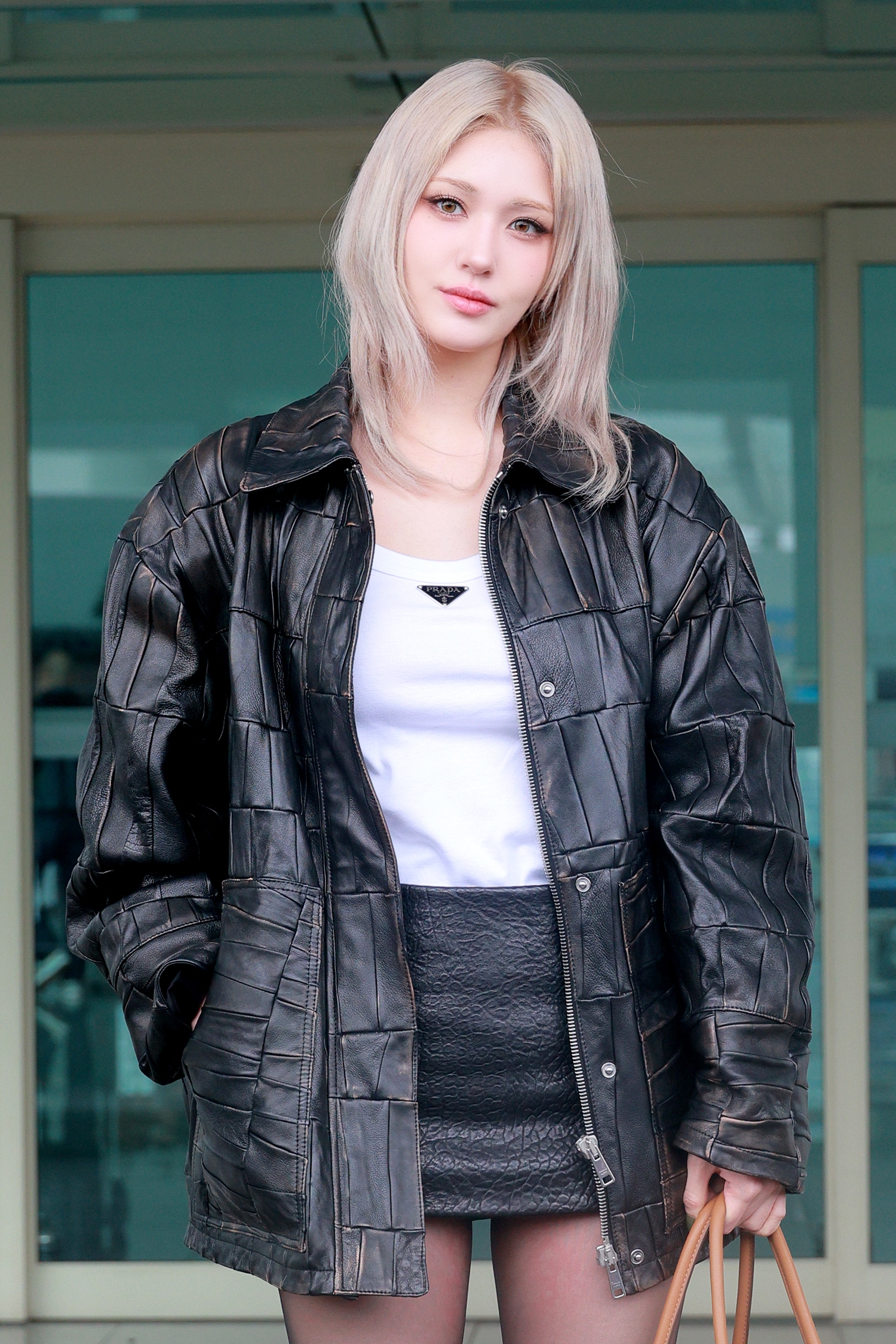 전소미는 유니크한 패치워크가 매력적인 레더 자켓을 포인트로 탱크 탑