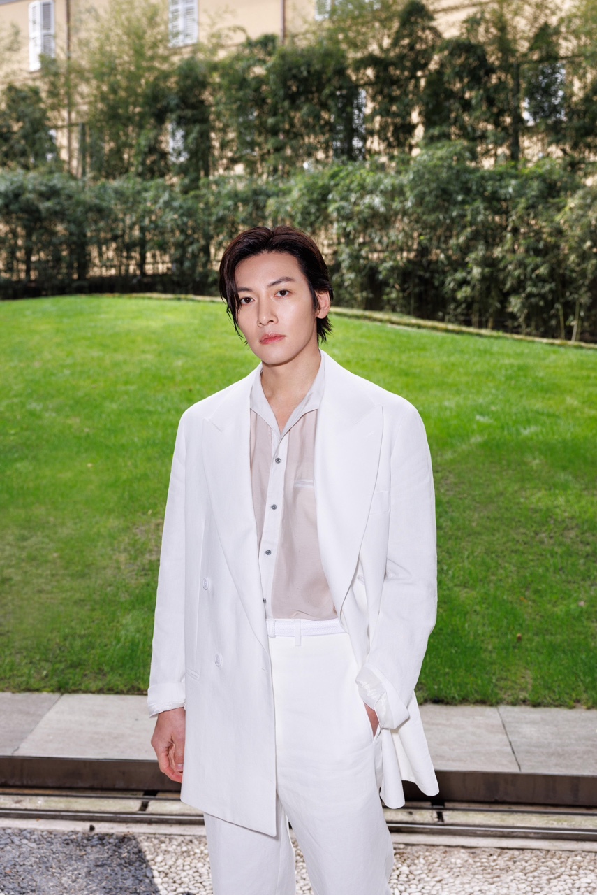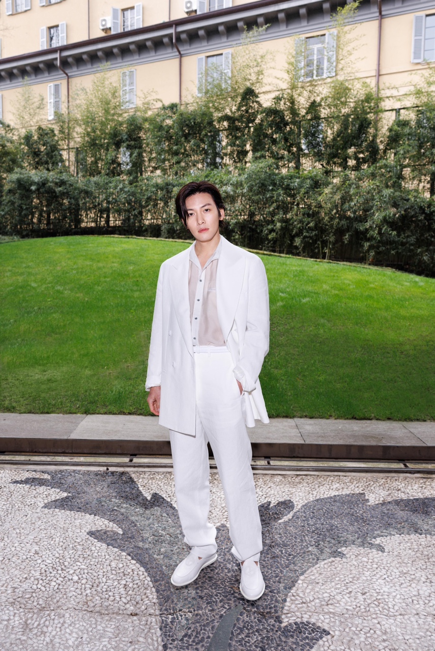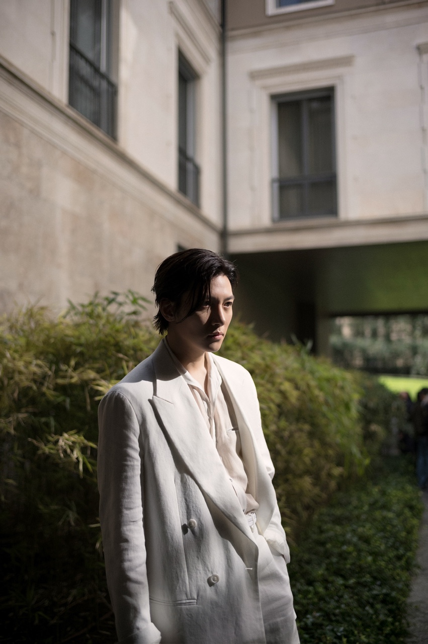 밀라노 현지에서 치장욱은 화이트 컬러의 투피스 수트에 부드러운 터치감의 화이트 셔츠를 이너로 매치
