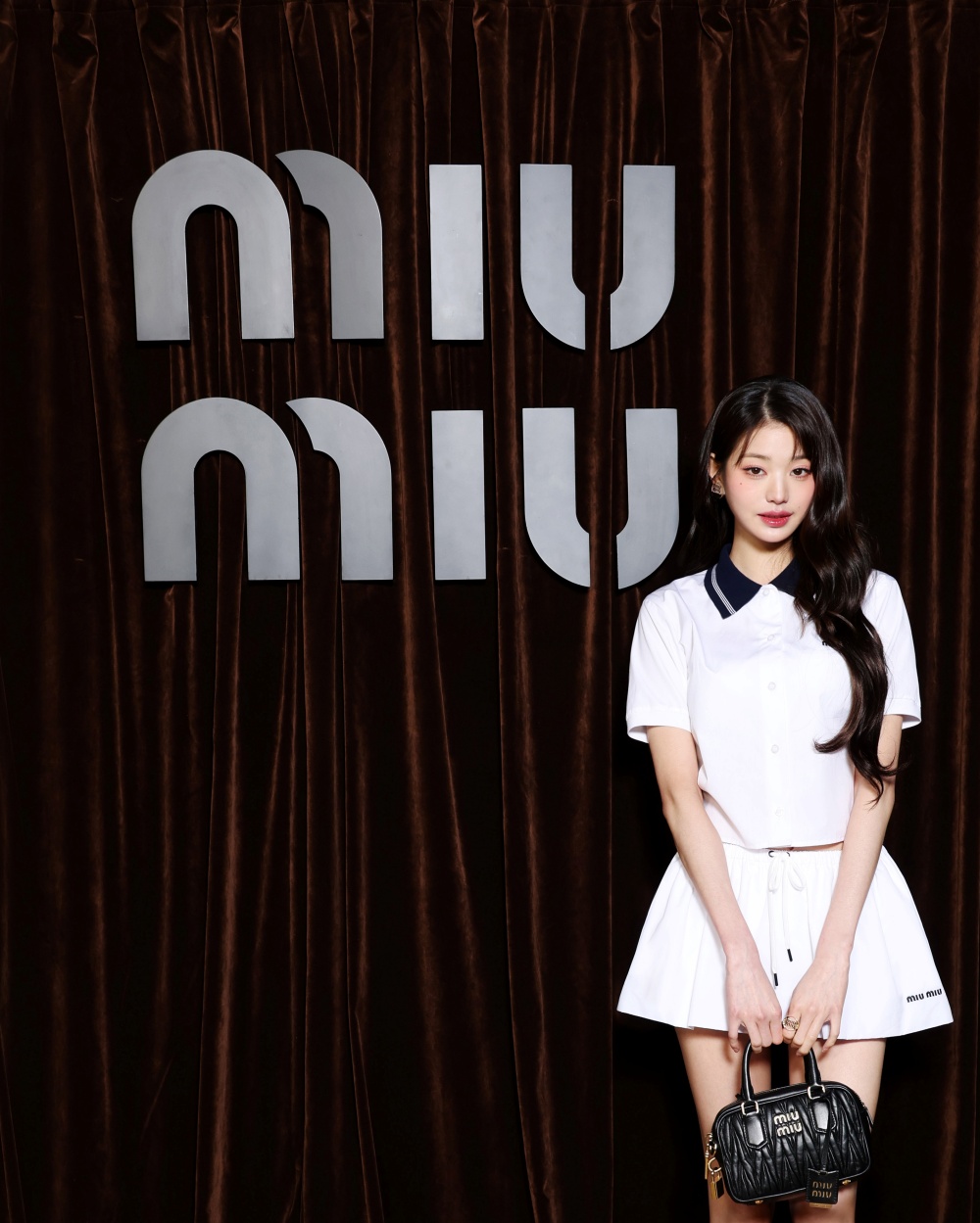 장원영은 화이트 컬러의 투피스 룩으로 화사한 스타일링을 선보였다