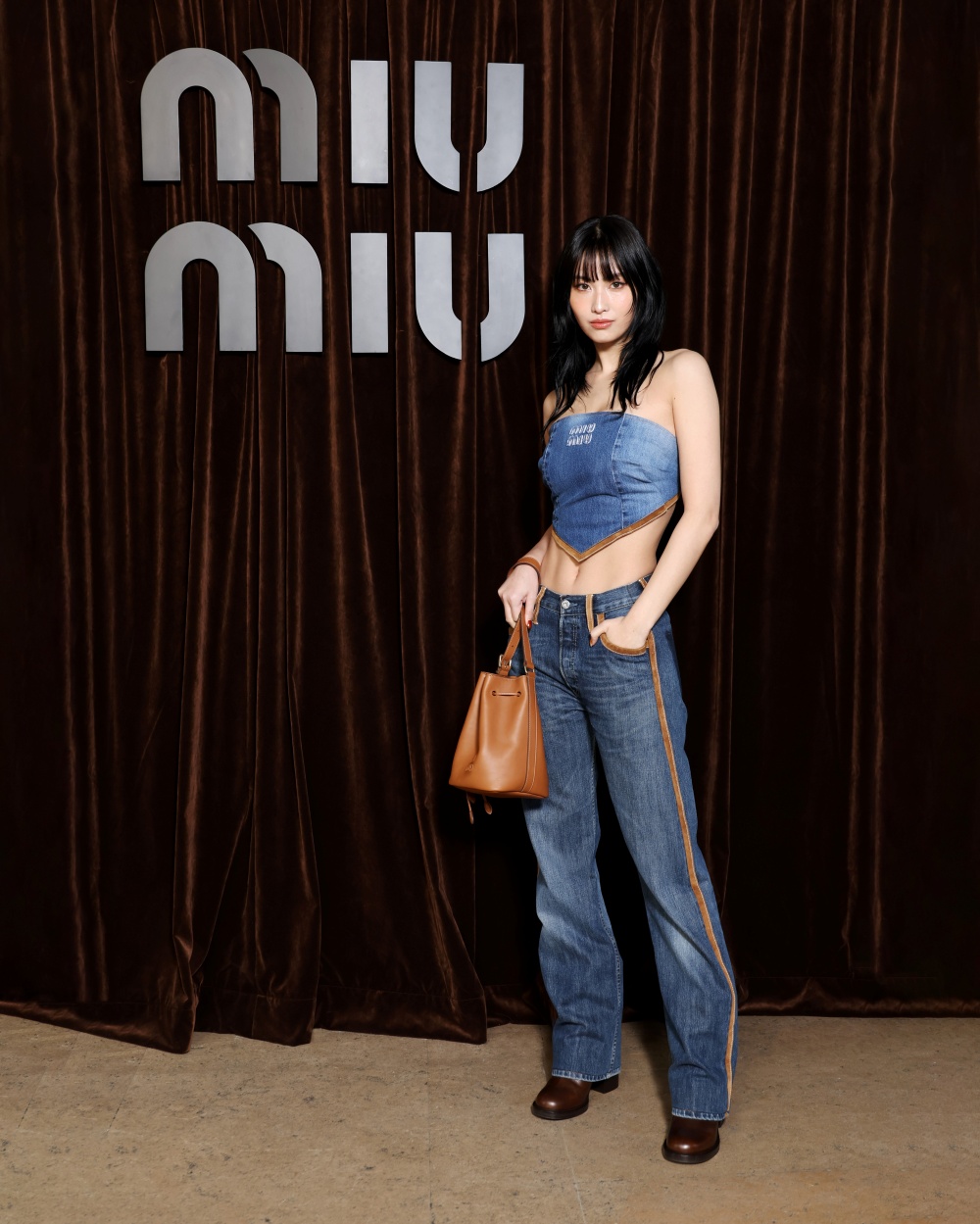 모모는 데님 튜브 톱과 레귤러 핏의 데님 팬츠로 매혹적인 자태를 뽐냈다