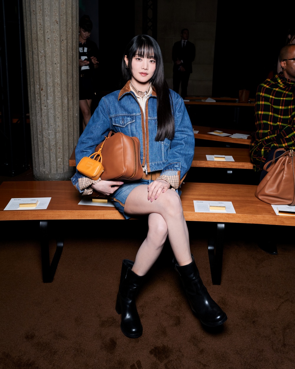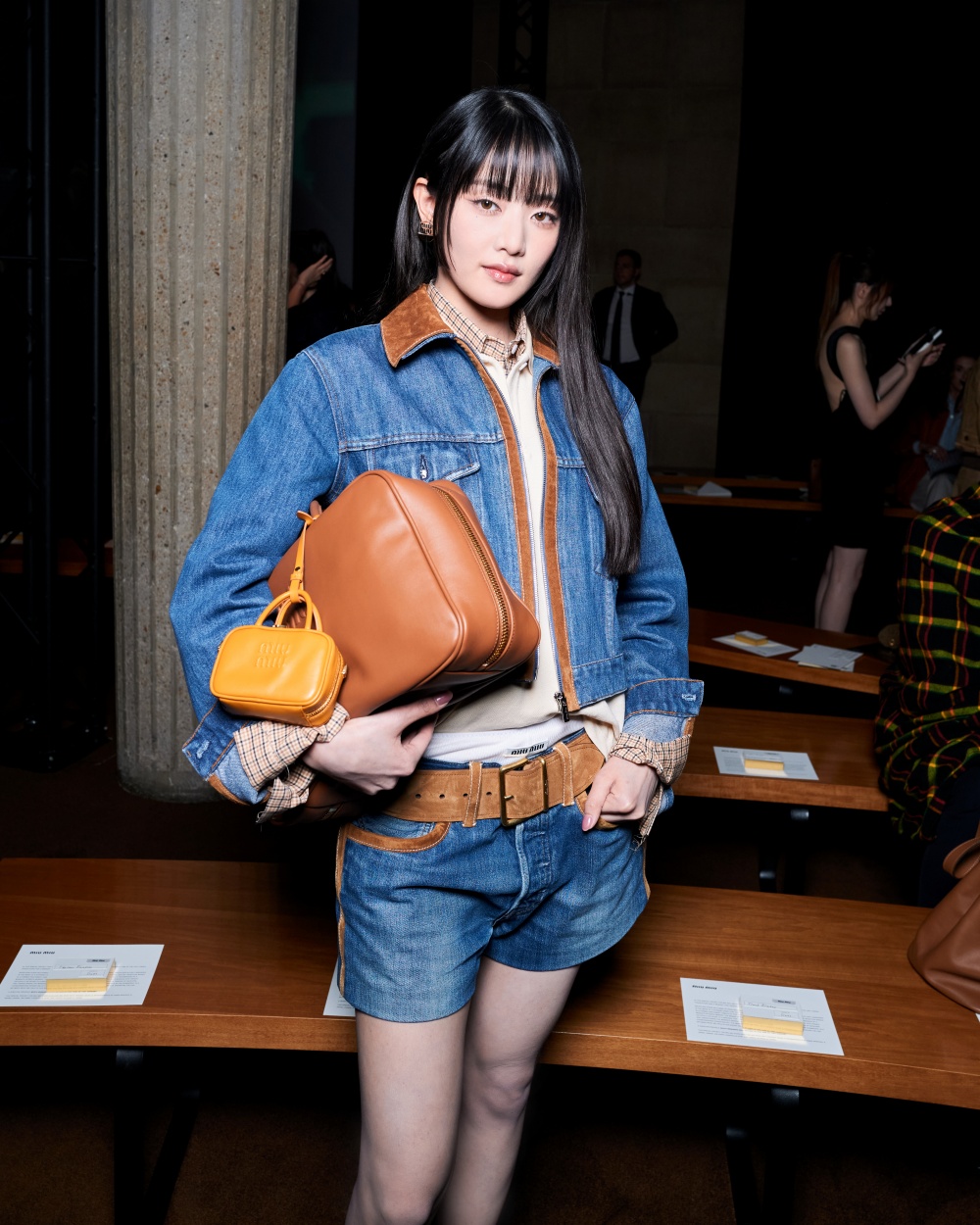 이날 민니는 데님 재킷과 숏 기장의 데님 팬츠로 매력적인 청청 패션을 완성했다